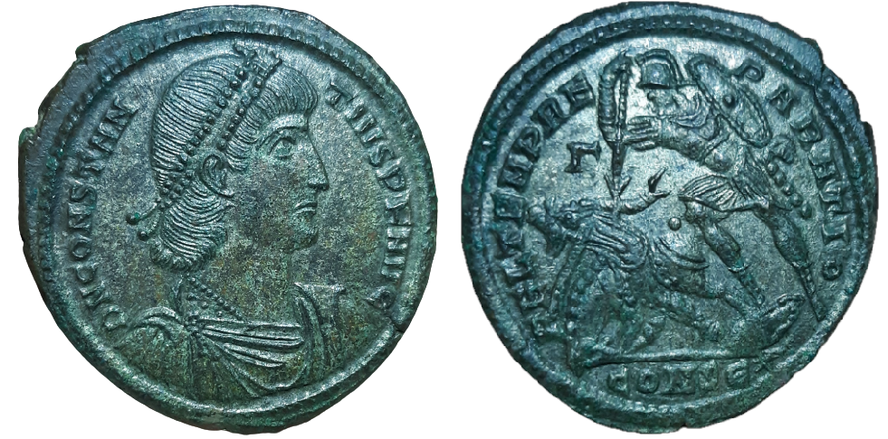 Obv: D N CONSTANTIVS P F AVG. Pearl-diademed, draped and cuirassed bust. Rev: FEL TEMP REPARATIO // Γ // CONSE* in ex. Soldier spearing fallen horseman. Type FH3. RIC 82. Prov: Ex-Bertolami Fine Arts #37 (Rome, 19 Sep 2017) & e-#92 (London, 2 Oct 2020).