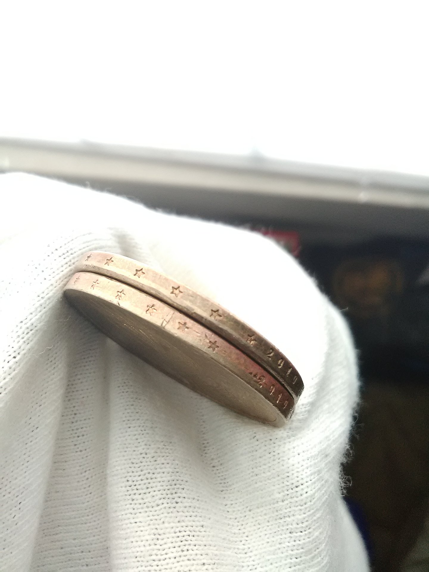 Alignment of off and bars across edge of bottom coin and doubling stars on top