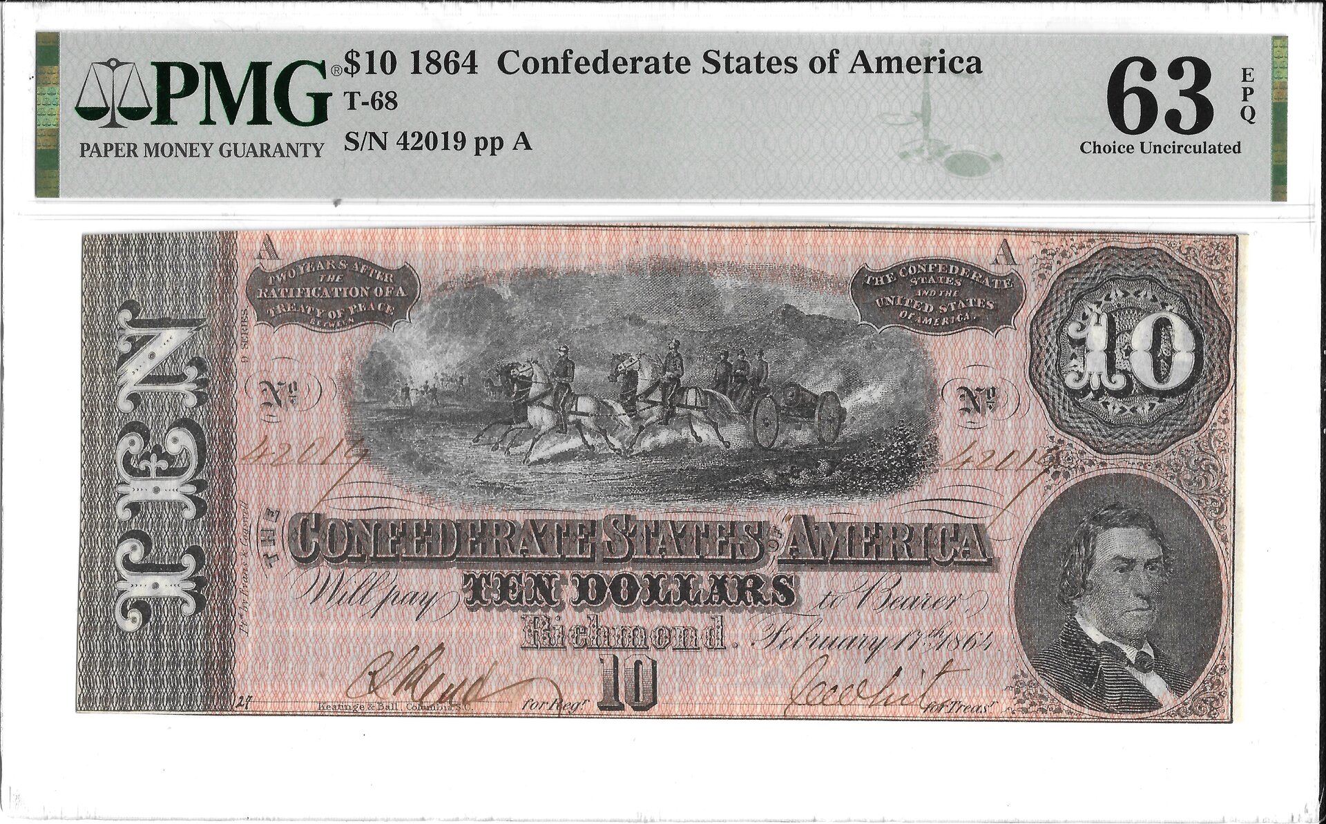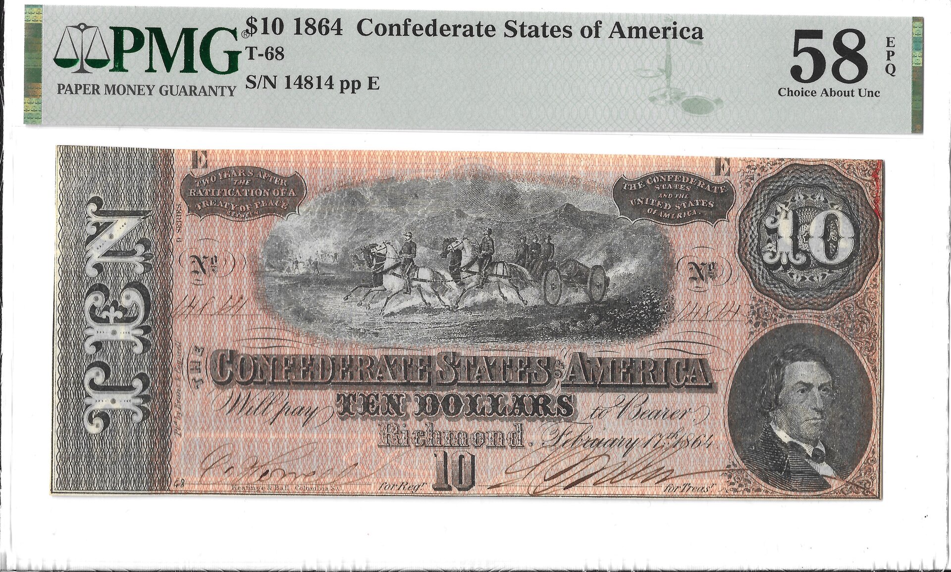 AU58EPQ Confederate $10, 1864 Obverse