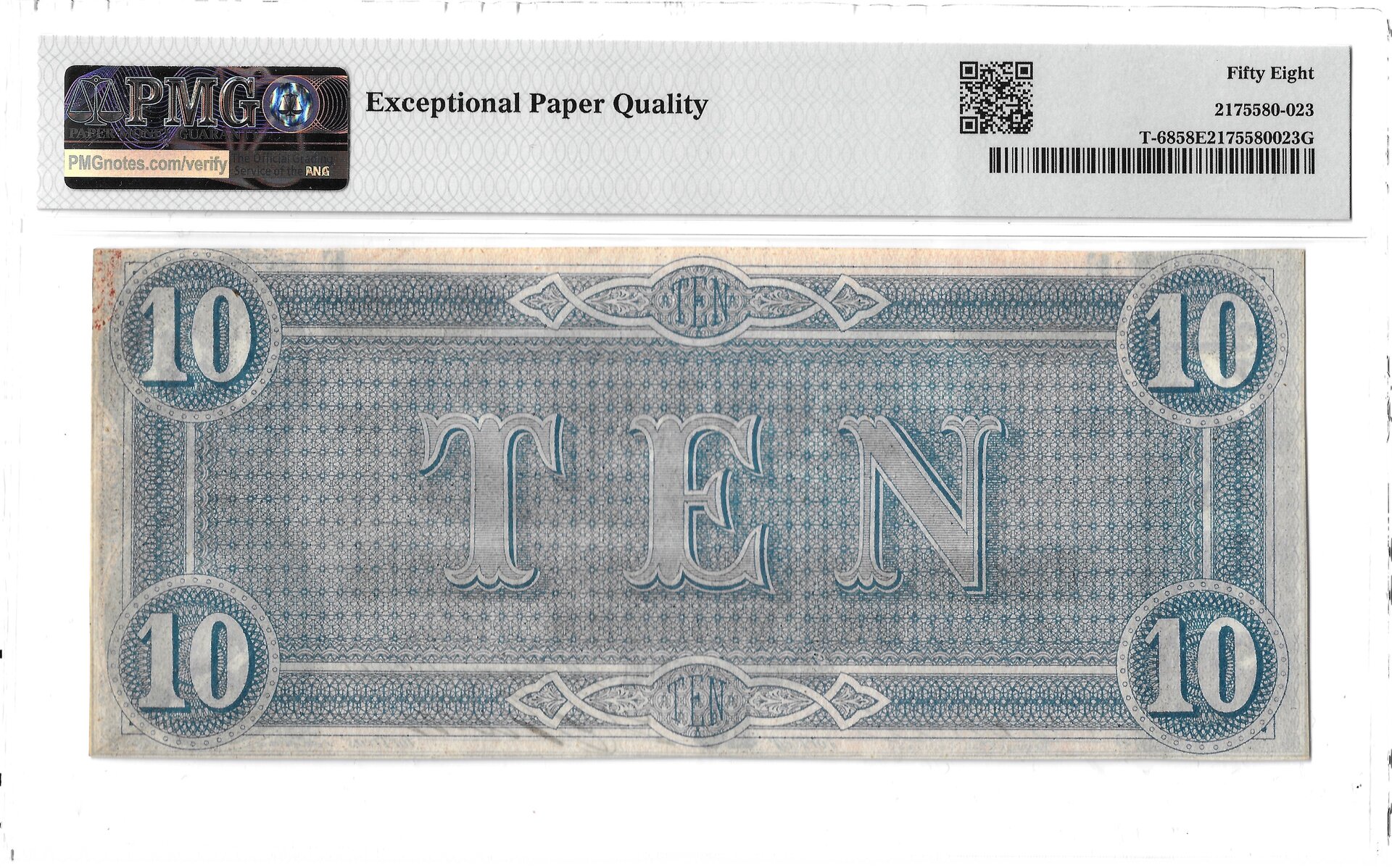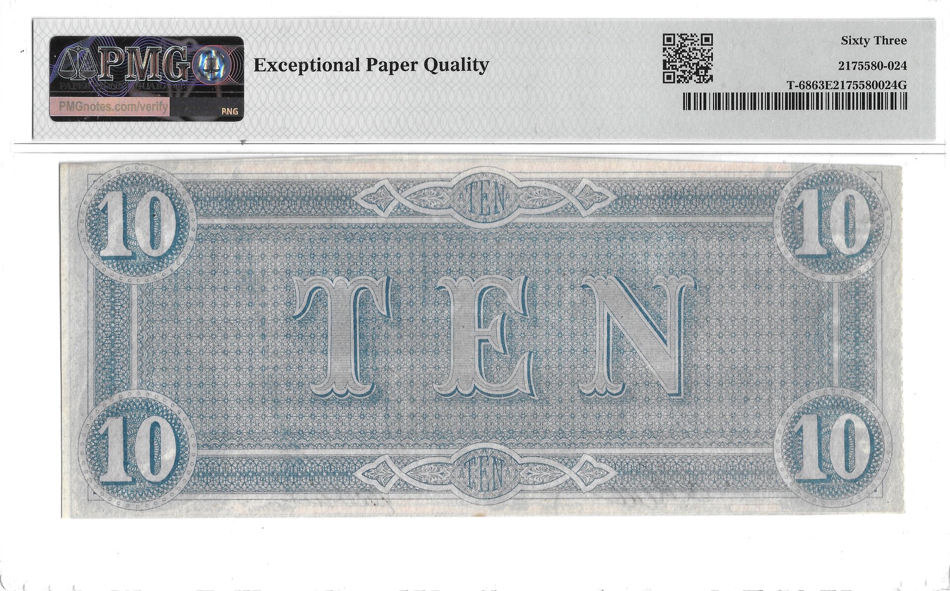 MS63EPQ Confederate $10, 1864 Reverse