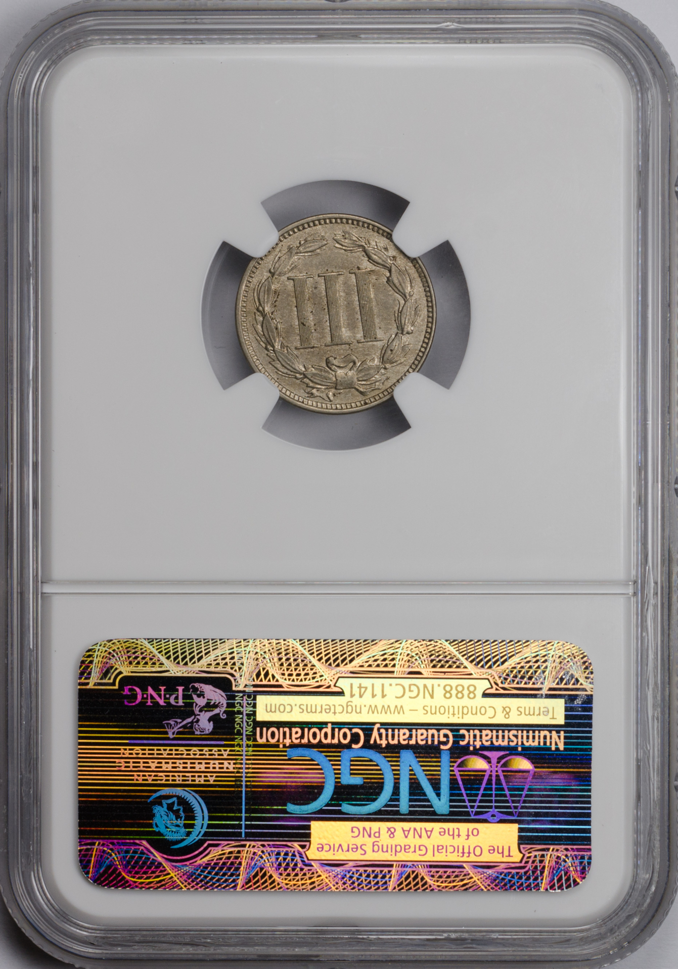 1869 THREE-CENT PIECE - COPPER-NICKEL NGC MS 58, CAC Reverse Slab