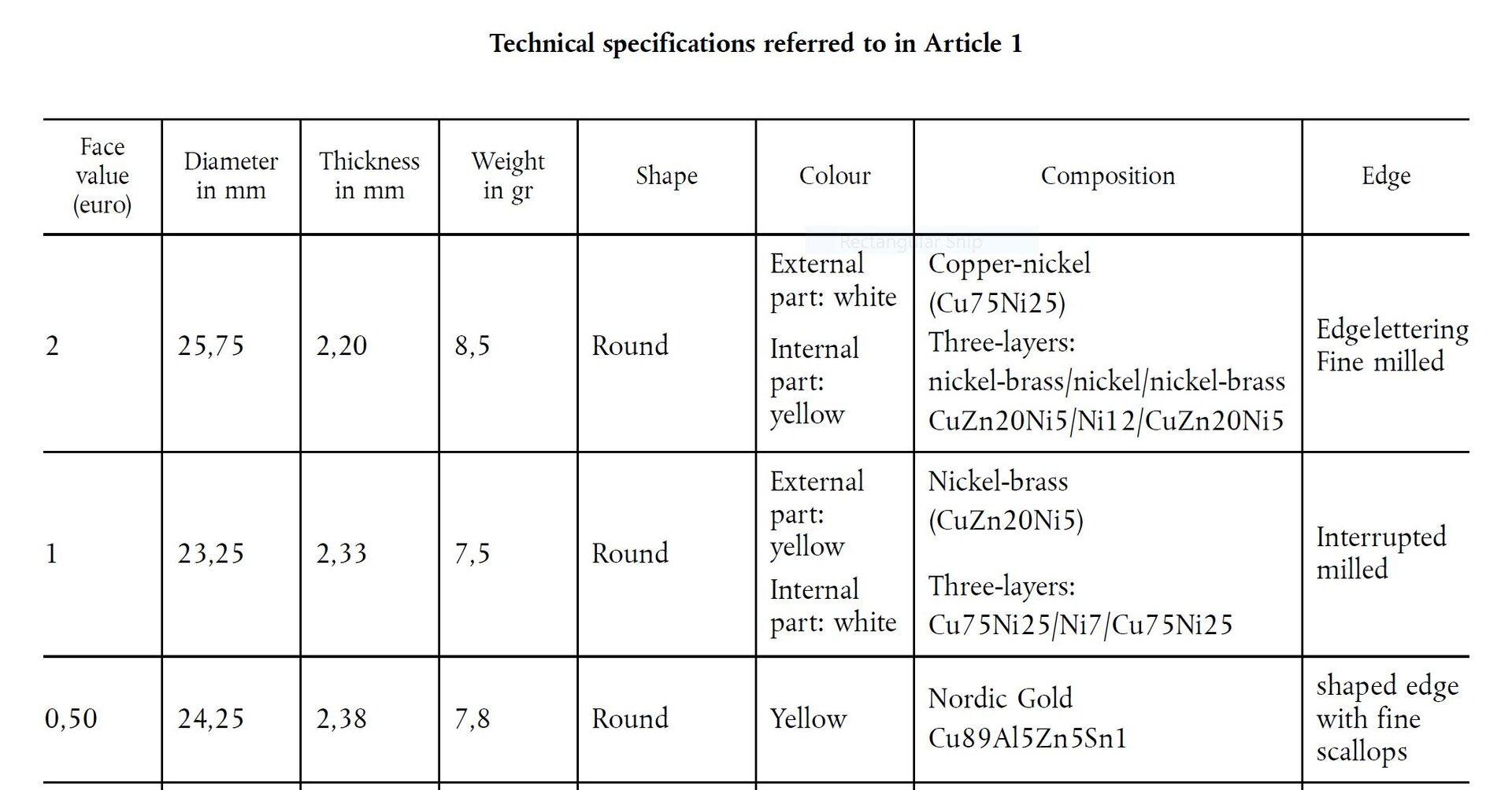 Euro coin specs