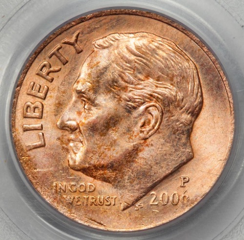 From the photos of missing clad layers and the one dime I have found with part of the clad layer missing I have never seen it missing or retained in a mottled pattern as your coin showes. What I have seen has a very defined edge between the clad and the copper. I still feel your coin to be tone in somewhat the manner that I stated. Since water played a part on toning your coin a simple oil residue in the protected areas your coin showes cladding could have preserved those areas.