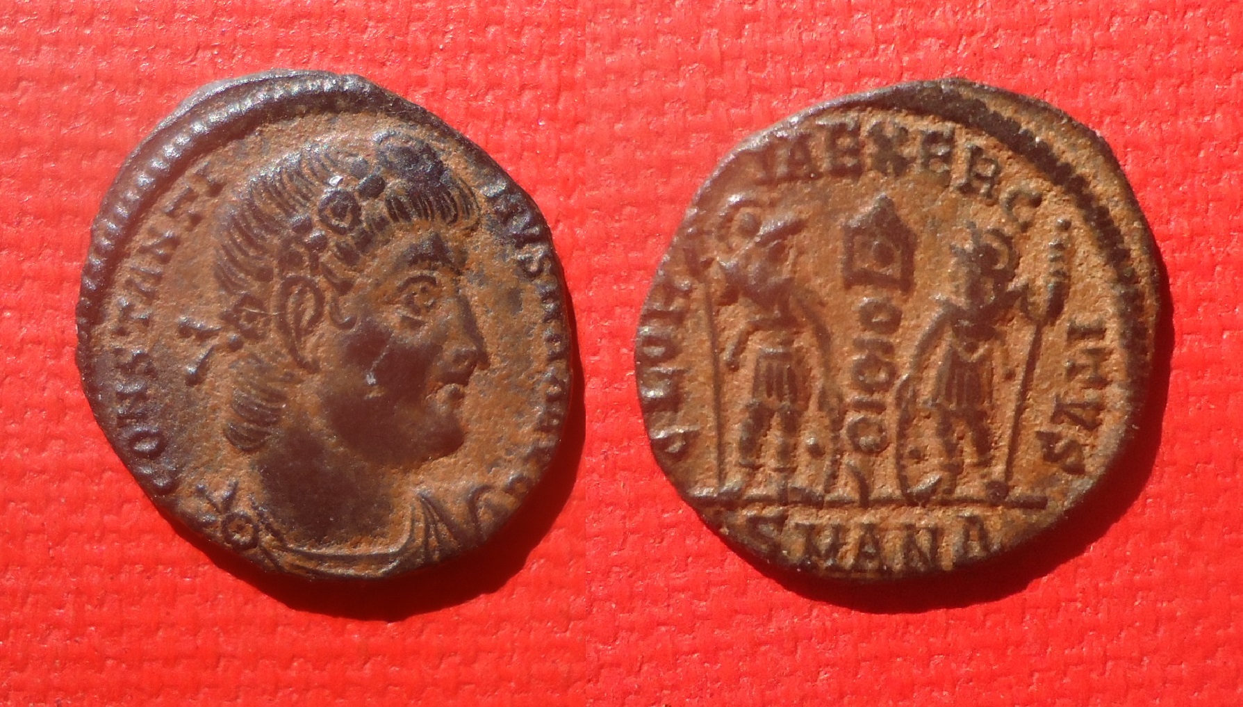 "Wading through garbage" is almost a mission statement for me; I almost never buy LRB's individually, but $10 on eBay got me this one (a year ago, mid-pandemic) - not "phenomenally alluring" for sure, but not chopped-liver either: Constantine I Follis (Æ 15) (335-337 A.D.) Antioch Mint CONSTANTI-NVS MAX AVG, rosette-diademed, draped and cuirassed bust right. / GLORIA EXERCITVS, two soldiers holding spears and shields with one standard between them, o on banner, SMANΔ in exergue. RIC VII Antioch 108, Δ (1.61 grams / 15 mm) eBay Feb. 2021 $10.00 BIN