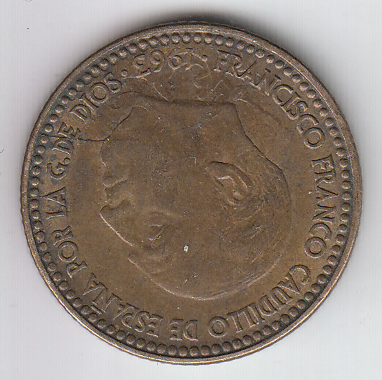 Die crack - rev, starting at the edge, going between D and E letters in "G.DE" and to the right. Die clash - both obv and rev in the upper area. I have my doubts because what is supposed to be die crack line goes then through Franco's chin and neck and ends at letter A in "FRANCISCO"; but it has very sudden transition from a sharp line to barely noticeable one. I beg your pardon if I express my thoughts oddly, English is not my native language.