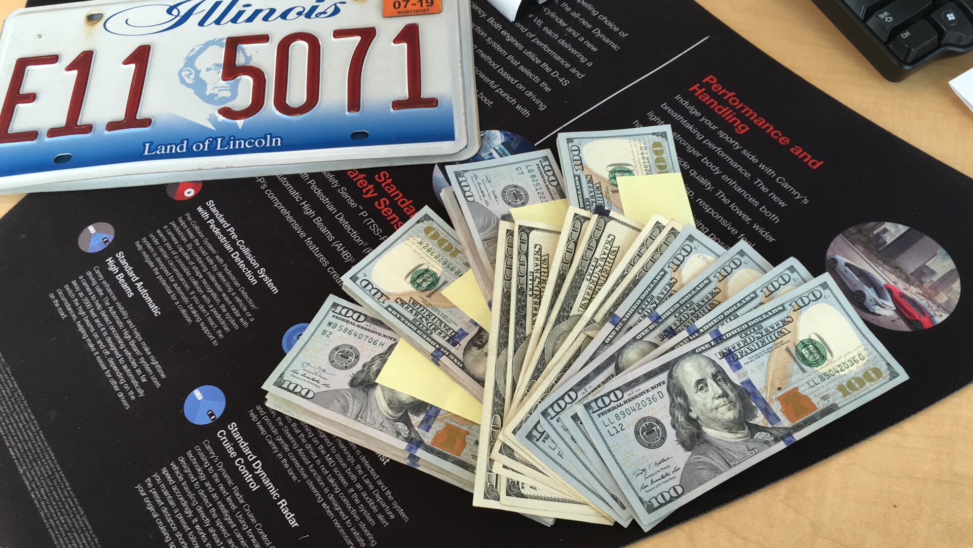 I’m sure this much $$$ is nothing for most of you guys, but it was really cool for me. I bought my current car (used Prius) from a dealership. After we agreed on everything about the car we walked back inside (you talk about the car outside ... you talk about the $$$ inside). The sales-guy went to get the $$$-guy and I laid this out on his table. They came back and the car-guy stops and says “What’s this?”. My answer was “Five(5) stacks ... out the door.”. “Stacks" seemed to be the current phrase on TV cop shows at the time and I just thought it was cool and wanted to say it. The $$$-guy laughed and thought about it for a second, picked up the $$$ and said he was going to get the paperwork.