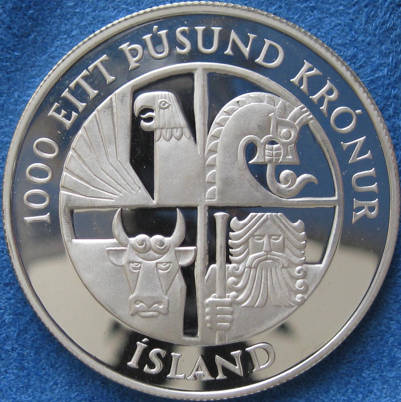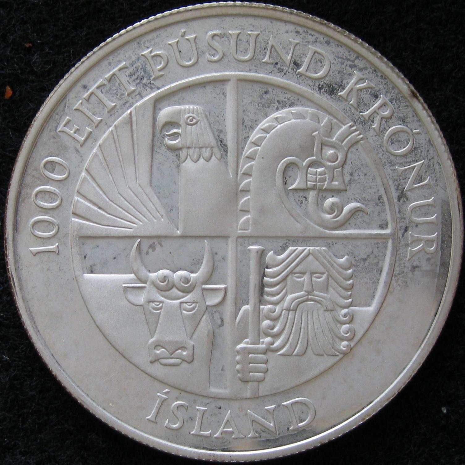 Let me start by saying I in NO WAY condone cleaning or dipping of coins. I picked this 1000 Kronur up yesterday at a coin show. It was in a 2x2 flip, when I was looking at it thru the flip it appeared to be slightly toned. I had no problem purchasing a toned coin thinking it nothing more than a little NT. Anyway, I got the coin home and took it out of the 2x2 flip to put it directly into an airtite. What I thought was toning was some kind of "powdery" substance. I went into panic mode, I wanted to wipe the powder off but made myself stop, and put it down. Here is the photo, notice the upper left at 11 o'clock.