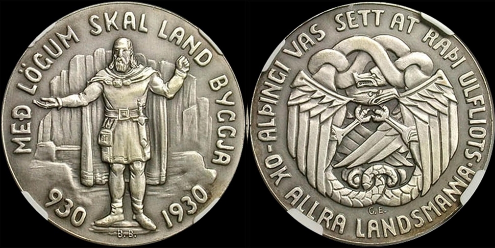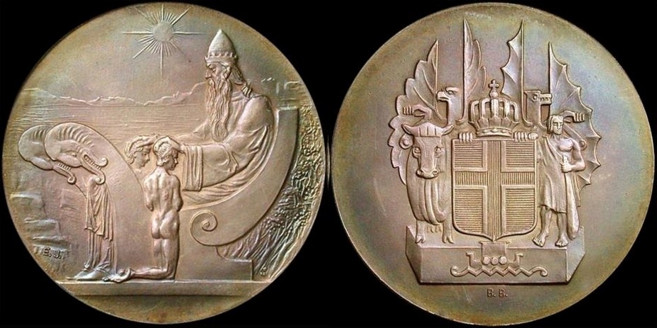 Minted in 1930 to commemorate the 1000-year anniversary of the Althing this is one of the more stunning coins ever made (in my humble opinion). I find it hard to fathom a 1000-year anniversary of anything. This coin was minted at the Saxon State Mint in Germany at the request of the Icelandic Parliament, the Althing, to commemorate their anniversary. It is one of the oldest parliamentary institutions in the world and a forerunner of the Western Democracy style of governing. The obverse of the coin is a magnificent relief of the King of Thule on his throne, with his hands on the heads of kneeling children; it bears the initials EJ, for designer Einar Jonsson. The reverse is the Icelandic coat of arms with a sailing ship, shield, and crown surrounded by four mythic creatures. It bears the initials B.B. for designer Baldvin Björnsson. There was a total mintage of 10,001 pieces. This piece is 45mm in diameter and about 1-1/2 ounces of silver. In addition to being a historically significant design, the coin was designed by 2 of the leading artists of their time. Einar Jónsson was an Icelandic sculptor, born in Galtafell, a farm in southern Iceland. At a young age, Einar proved himself to be an unusual child with an artistic bent. At that time there was little or no tradition of sculpture in Iceland, so Einar moved to Denmark where he attended the Copenhagen Academy of Art. In 1902 the Althing, the Icelandic parliament, awarded Einar a grant to study in Rome for 2 years. He returned from Rome to Copenhagen and settled down there. According to The Einar Jónsson Museum in Reykjavik after residing in Rome: "Jónsson completely rejected naturalistic depiction and publicly criticized the classical art tradition, which he felt had weighed artists down. He emphasized the need for artists to forge their own path and cultivate their originality and imagination instead of following the footsteps of others. His ideas were related to German symbolism, and he developed a figurative language composed of interpretable symbols, personification, and allegory." In 1909, after living abroad for almost 20 years he made an arrangement with the Althing to provide him with a home and studio in Reykjavík. In return, he agreed to donate all his works to the country. Einar designed this combination living and working space in collaboration with Architect Einar Erlendsson, though early plans for the house were designed for him by Iceland's State Architect, Guðjón Samúelsson, but these were never realized. In 1914 Einar was awarded a commission by Joseph Bunford Samuel to create a statue of Icelandic explorer Þorfinnur Karlsefni (Thorfinn Karlsefni) for placement in Philadelphia. Bunford commissioned the sculpture through a bequest that his wife, Ellen Phillips Samuel, made to the Fairmount Park Art Association specifying that the funds were to be used to create a series of sculptures "emblematic of the history of America." Thorfinn Karlsefni was installed along Philadelphia's Kelly Drive near the Samuel Memorial and unveiled on November 20, 1920. There is another casting of the statue in Reykjavík, Iceland. In 1917, the day after he married Anne Marie Jørgensen, he and his bride traveled to the United States to complete the work, and today Einar's intrepid Norseman stands on East River Drive in Philadelphia. Several years later, in 1921, his second major North American work was erected when the Icelandic community in Manitoba, Canada purchased a casting of his Jón Sigurðsson statue and had it placed in the Manitoba Legislative Building grounds in Winnipeg. As with the version in Reykjavík, this statue included the bas relief The Pioneers on the base. After two years in America, Einar returned to Iceland where he produced an amazing body of work, none of it seen outside the country. Unlike most other sculptors, Einar worked almost entirely in plaster. This had to do partly with the lack of good modeling clay in Iceland, but it allowed Einar to work on his individual sculptures for years. Spending over a decade on a particular piece was not uncommon for him. Baldvin Björnsson was an Icelandic painter and goldsmith. He became the first Icelandic artist to work in the abstract while he stayed in Berlin from 1901 to 1914. Baldvin was the son of the saintly daughter of Sigrid and Bjorn Arnason goldsmith. He trained as a goldsmith with his father in Isafjordur and then moved to Copenhagen to work fully in the trade. After that, he went to Berlin where he worked for thirteen years at the gold shop. Where he married Martha Clara Bemme (later Björnsson). They had three sons, Hauk merchant (1906), one of the founders of the Communist Party of Iceland, Harald Stein merchant (1910) and Bjorn Theodor art historian (1922). Hw and Martha moved to Iceland when World War I broke out. There is little information on Friedrich Hornlein, the engraver, aside from references to this coin. Obverse Designer: EJ - Einar Jonsson Reverse Designer: BB - Baldvin Bjornsson Subject: 1000 Years Althing Note: Prev. KM#M3. FH stands for Friedrich Hornlein, the engraver. Composition: Silver Weight: 45.0000 Diameter: 45mm Sources: Wikipedia and others