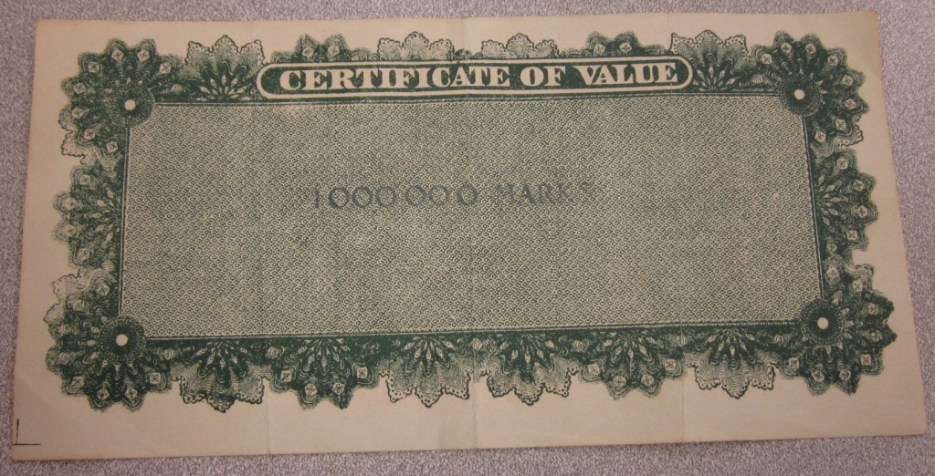 Hello paper money folks. I am a long time Paper money forum lurker but have never posted in the paper money forum before this. Most of my paper collection consists of error notes. Let me know if ever want to see my paper errors. Today a friend gave me this note. A guess might be that it has something to do with an occupation in Germany during a period of hyper inflation. It looks like it has a small portrait of George Washington & there are a couple six-pointed stars. The only words printed are in English and the denomination is apparently 1,000,000 Marks. Can anyone tell me what I've got here? (My friend has several of these in an envelope).