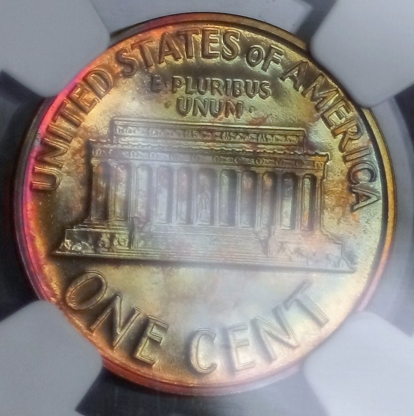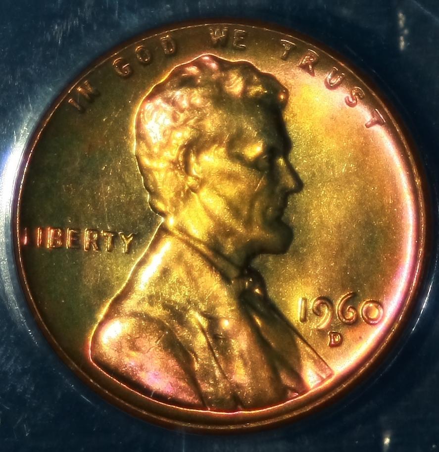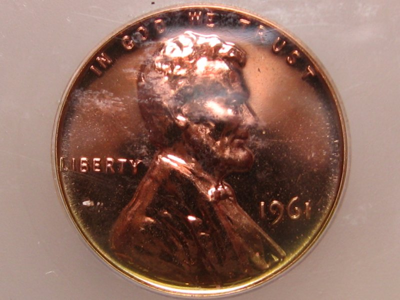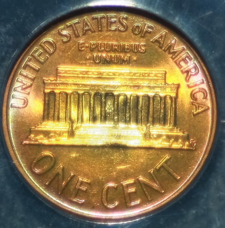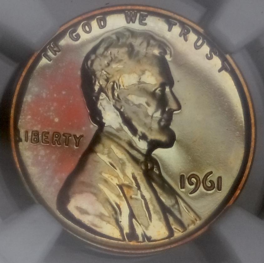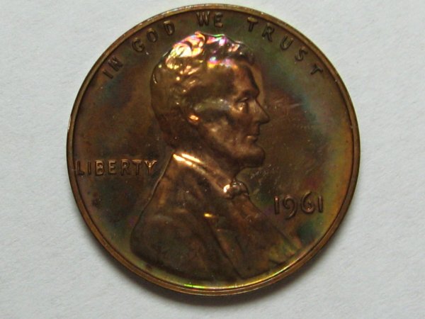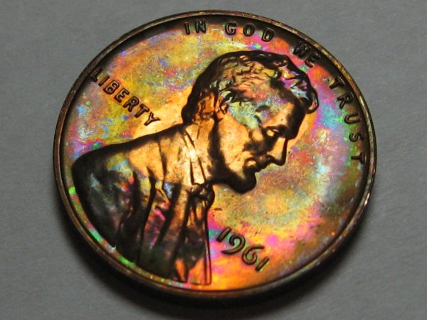 The Anomaly of 1961 (for colorfully-toned Proof Lincolns). The year 1961 is "The Goldmine Year" for colorfully-toned Proof Lincolns. If you are looking for a Proof Lincoln with knock your socks off color, focus on the year 1961. Here are just a few of the colorfully toned examples I have found from that anomalous year. Shown below is a bar chart showing the number of PCGS graded Brown (BN) Proof Lincolns from 1936-1975. Brown (BN) graded Proof Lincolns show less than 5% original mint-red color; and is the color category most rich with wildly colorful examples. Note that this chart was computed from PCGS Census Reports in late March 2012, and these numbers will change over time. Shown in the center of the chart is the anomalous year of 1961, a veritable "goldmine" of colorful Brown (BN) graded Mirror Proof Lincolns. The tall blue bar represents 37 BN graded slabed Proof Lincolns in year 1961, far outnumbering any other year by a long shot, especially those years surrounding 1961, from 1950 to 1975. What you would have expected to see in this chart is an exponential decline of BN graded Proof Lincolns, with larger numbers to the left of the chart (for the older dates) and smaller numbers to the right (for the more recent dates). This expected result should have occurred because older dated coins have had more years exposed to the enviroment (and more years to change colors from the mint fresh copper color). Of course 1961 sticks out like a sore thumb on the chart! One theory that I came up with is that perhaps there were trace impurities in the copper alloy used in 1961 that caused them to turn vibrant colors (I have seen many vibrantly colored 1961 proof lincolns inside the original (still sealed) mint cello packaging). However, one fly in the ointment for that theory is that I did not find a spike in colorfully toned Mint State (Business Strike) 1961's (only in the Proofs was there a spike in the populations). So then I am left with one possible remaining theory, that there was something about the Proof Set cello packaging in 1961 that led to many more colorful examples. Either impurities in the cello packaging -- or perhaps improper seals between the coins, or between the plastic mint button and the coins, or between the environment and the coins inside the cello. It is interesting to note that there were "mini-spikes" in colorfully toned BN graded Lincolns in the year before and after 1961. The years 1960 and 1962 also showed a smaller spike in color, but it was not nearly as pronounced as the year 1961. So whatever was going on in 1961, seems to have spilled over somewhat into the previous and the following year -- perhaps starting in Nov/Dec 1960 and ending in Feb/Mar 1962. The question now is "What?".