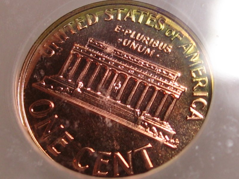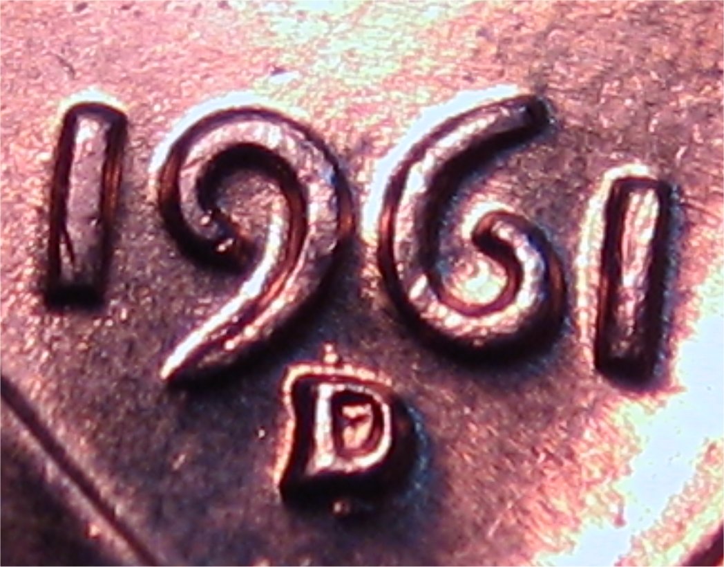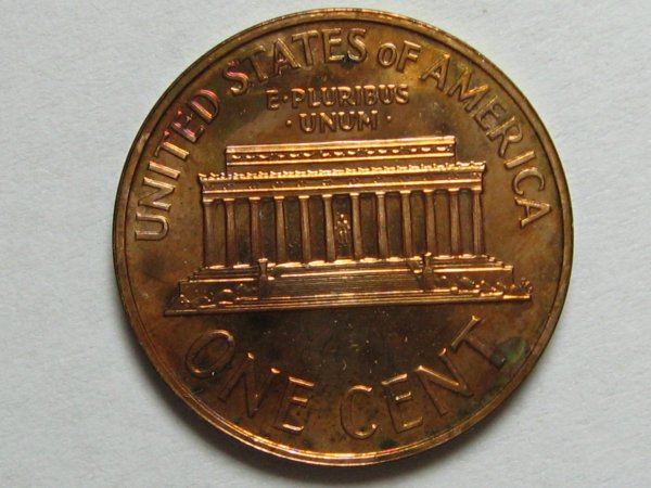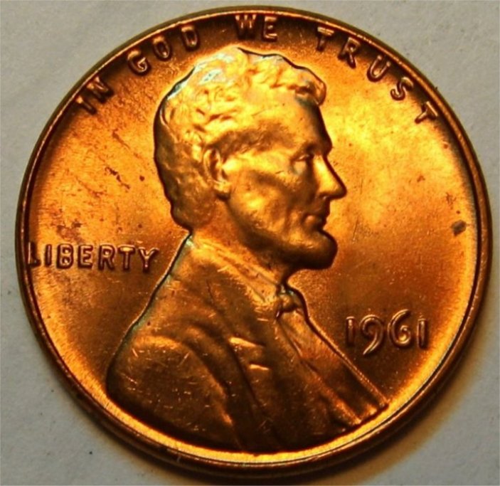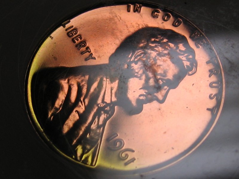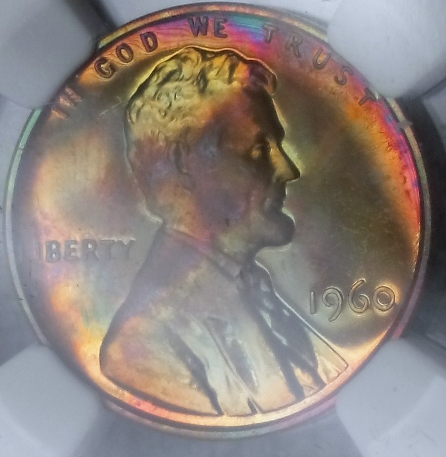 The Anomaly of 1961 (for colorfully-toned Proof Lincolns). The year 1961 is "The Goldmine Year" for colorfully-toned Proof Lincolns. If you are looking for a Proof Lincoln with knock your socks off color, focus on the year 1961. Here are just a few of the colorfully toned examples I have found from that anomalous year. Shown below is a bar chart showing the number of PCGS graded Brown (BN) Proof Lincolns from 1936-1975. Brown (BN) graded Proof Lincolns show less than 5% original mint-red color; and is the color category most rich with wildly colorful examples. Note that this chart was computed from PCGS Census Reports in late March 2012, and these numbers will change over time. Shown in the center of the chart is the anomalous year of 1961, a veritable "goldmine" of colorful Brown (BN) graded Mirror Proof Lincolns. The tall blue bar represents 37 BN graded slabed Proof Lincolns in year 1961, far outnumbering any other year by a long shot, especially those years surrounding 1961, from 1950 to 1975. What you would have expected to see in this chart is an exponential decline of BN graded Proof Lincolns, with larger numbers to the left of the chart (for the older dates) and smaller numbers to the right (for the more recent dates). This expected result should have occurred because older dated coins have had more years exposed to the enviroment (and more years to change colors from the mint fresh copper color). Of course 1961 sticks out like a sore thumb on the chart! One theory that I came up with is that perhaps there were trace impurities in the copper alloy used in 1961 that caused them to turn vibrant colors (I have seen many vibrantly colored 1961 proof lincolns inside the original (still sealed) mint cello packaging). However, one fly in the ointment for that theory is that I did not find a spike in colorfully toned Mint State (Business Strike) 1961's (only in the Proofs was there a spike in the populations). So then I am left with one possible remaining theory, that there was something about the Proof Set cello packaging in 1961 that led to many more colorful examples. Either impurities in the cello packaging -- or perhaps improper seals between the coins, or between the plastic mint button and the coins, or between the environment and the coins inside the cello. It is interesting to note that there were "mini-spikes" in colorfully toned BN graded Lincolns in the year before and after 1961. The years 1960 and 1962 also showed a smaller spike in color, but it was not nearly as pronounced as the year 1961. So whatever was going on in 1961, seems to have spilled over somewhat into the previous and the following year -- perhaps starting in Nov/Dec 1960 and ending in Feb/Mar 1962. The question now is "What?".