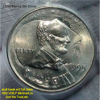 NINETEEN NINETY FIVE 1995 DOUBLE DENOMINATION - KEY DATE Two Full dates obverse. Two Full dates 1995, 2 LIBERTY, IN GOD WE TRUST,P MINTMARK,VDB, Skull break, Crack die variety, ONE CENT,ONE DIME, UNITED STATES of AMERICA, E Plu, FG Initial, Lincoln memorial building split in Half-A crack die Variety,Dime reeding is Neat partial Plain edge of a cent. NO DING on any Rim surfaces with Mirror look like in some areas. The Top Two Great Presidents Obverse voted by Presidential Historian Society among 41 Presidents served in oval office. (WHITE HOUSE). NINETEEN NINETY FIVE 1995 NINETEEN NITY FIVE Double Denomination MINT
