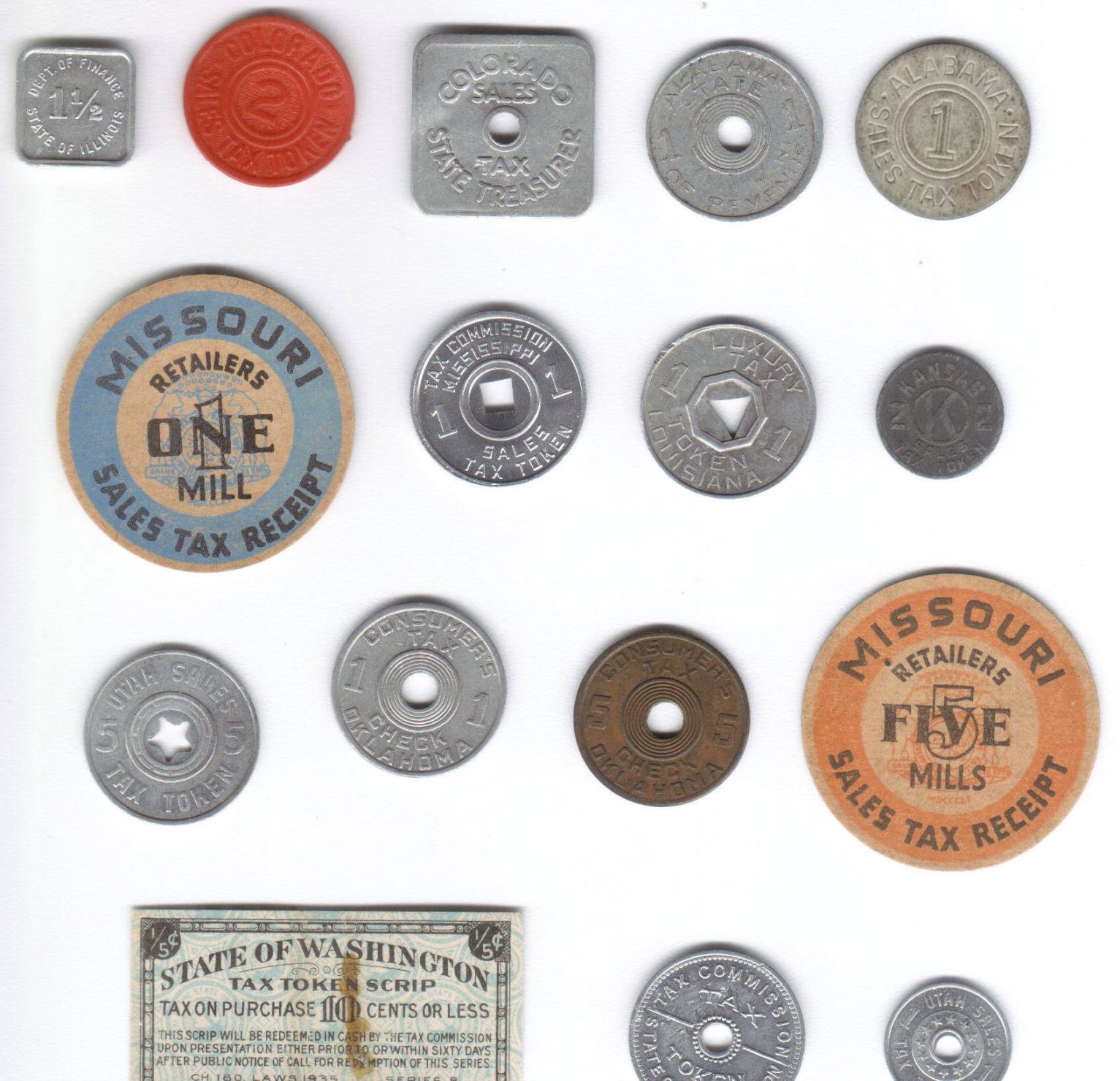 16 diff Depression-era State Sales Tax Tokens, $18 postpaid