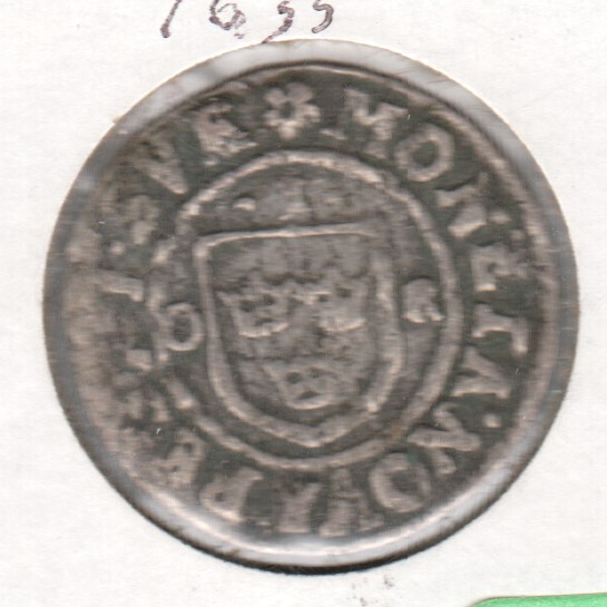 Hi - this shows that design on a 1 Ore Stockholm 1633 - 1653 http://ingemars.se/aldre_sv.htm Also you might be interested in this - different mint but it is very similar to yours and silver. http://metaldetectingworld.com/detecting_tavern_site_p23.shtml