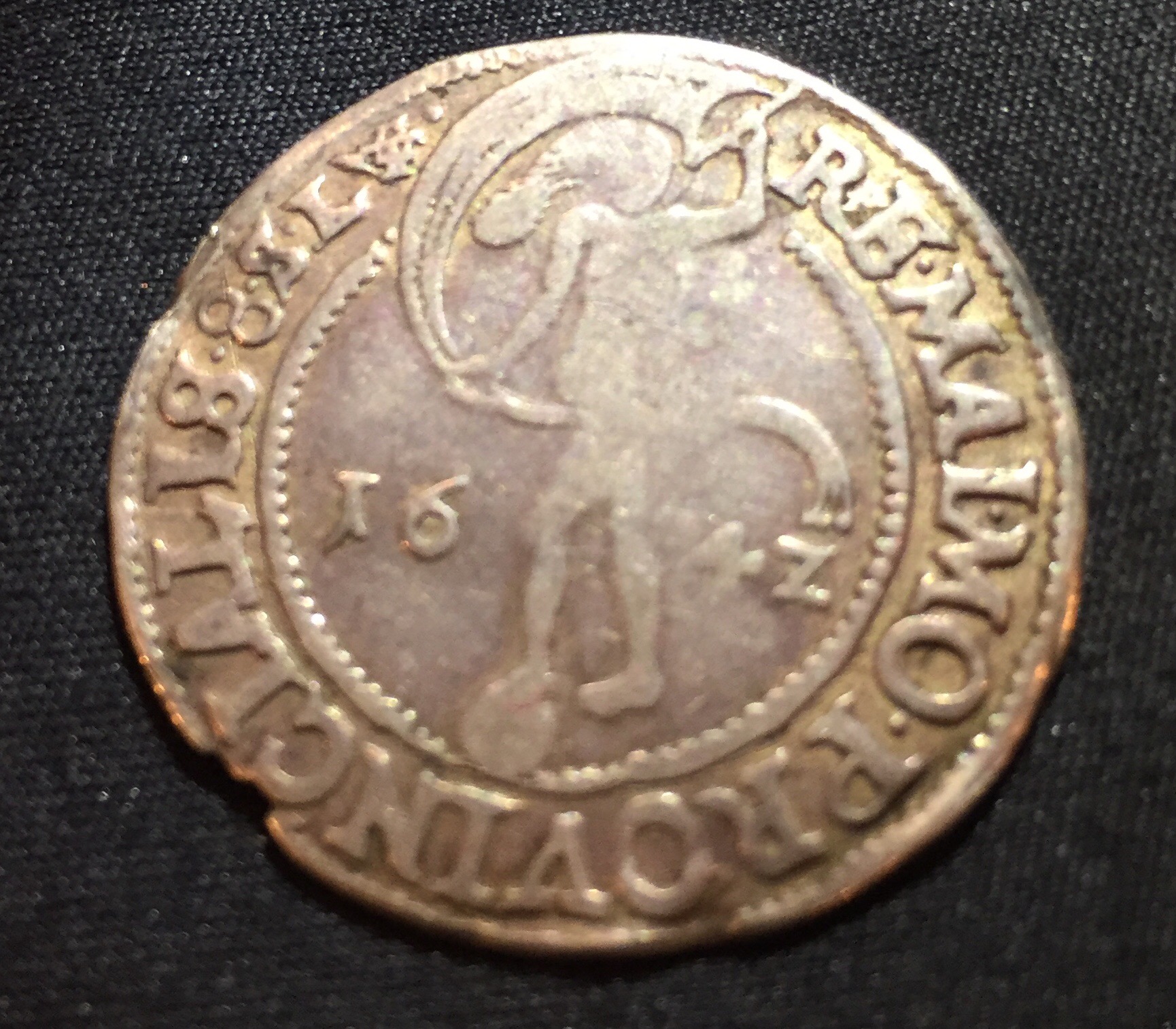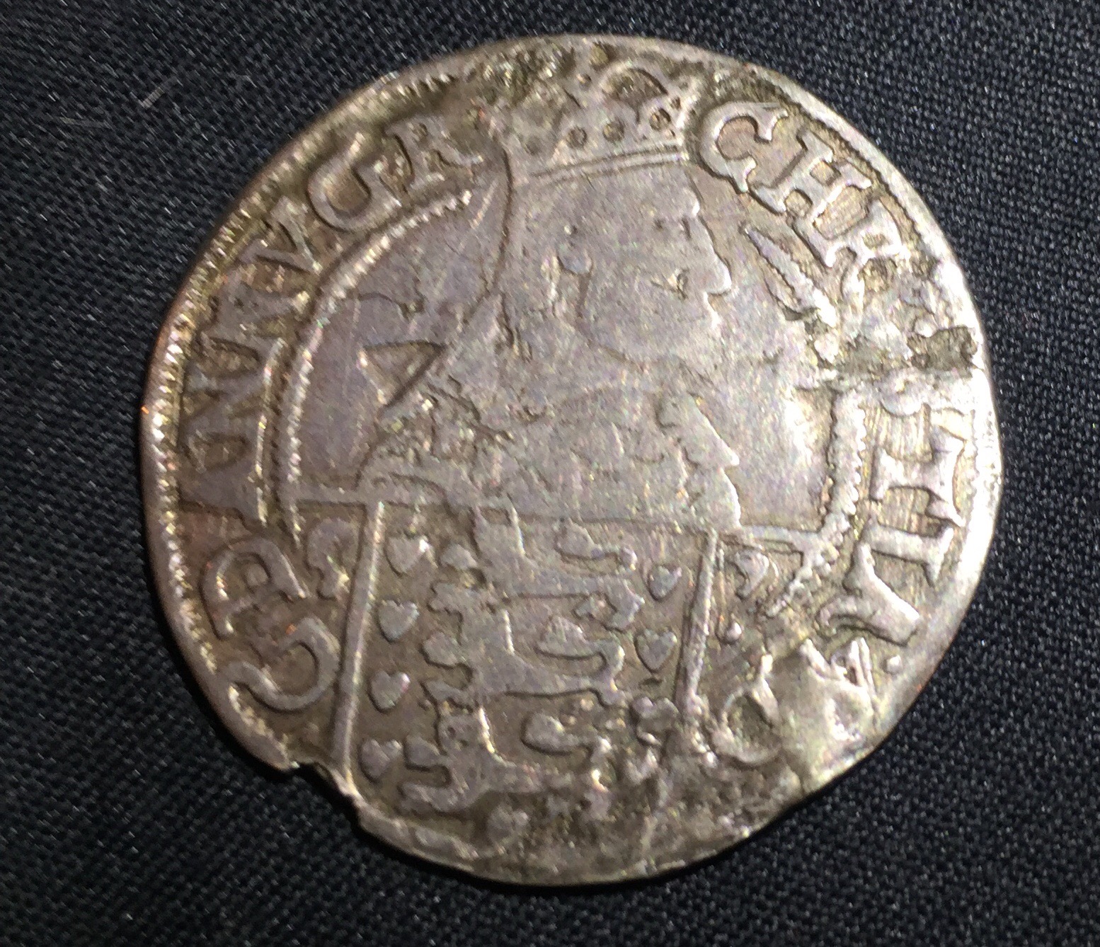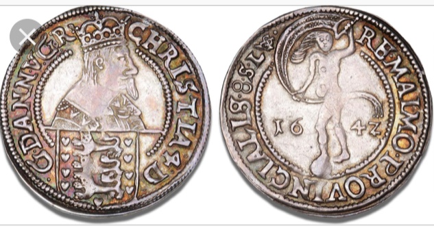 TheRed is correct. Denmark/Gluckstadt. In my 2003 3rd edition Krause catalog KM#30.2 1642 8 Skilling Lybsk. .812 silver grade/value G-$40.00 VG-$80.00 F-$185.00 VF-$375.00 I am not sure what your coins grade is ? The values might be higher now on the current market ?