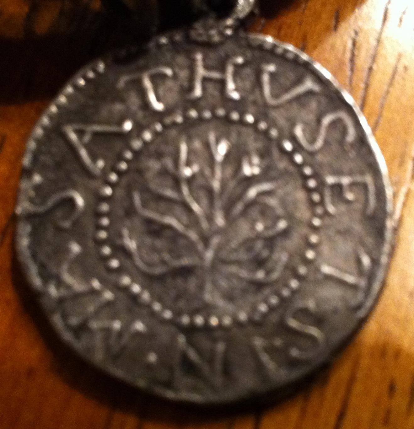 Hi All, These appear to be modern reproductions of an Oak Tree Shilling from Massachusetts. I do come across many of these that have been made into jewelry over the years. One of the big giveaways (minus the surfaces which are not right for MA silver) is the letter W in NEW ENGLAND. On all Oak Tree coinage the middle of the W crosses at the top and is connected with a line. There is no W that crosses like this one does. Keep in mind, just because a piece was made into jewelry does not necessarily make it a fake colonial. On EBAY in the last year a well known collector purchased an genuine Pine Tree Shilling (Noe 3) in XF45 made into a necklace (which seemed contemporary!) for $18 because everyone assumed that nobody would use a real coin. Well, we were all wrong! I saw and confirmed the piece as genuine at the ANA in Boston this year!