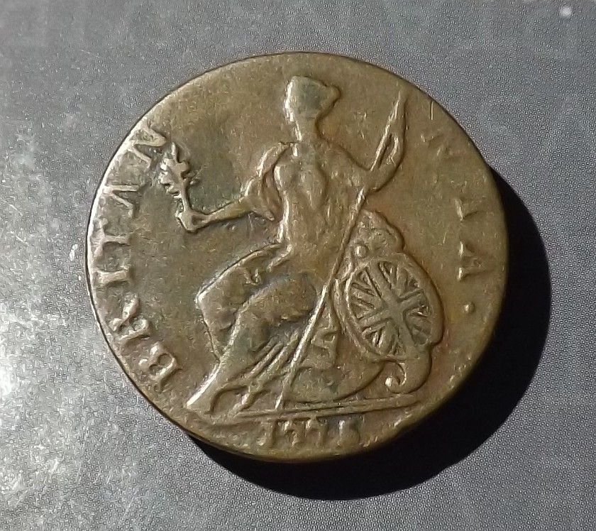 Looks like it may be a counterfeit, but it is definitely not a Machins. 1775 seems to be the most common year for counterfeit British halfpence.