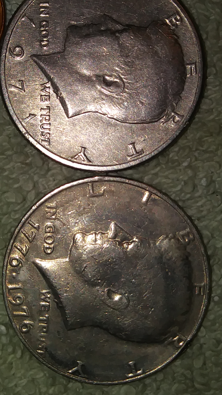 I need some advice on a 1776-1976 no mint mark Kennedy Bicentennial half dollar but the coin only weighs 10 grams so I'm kind of confused on this coin and it looks like damage but but it's only damaged on one side and kind of looks like a strikethrough also in the light thank you with any knowledge will be helpful on half dollars specific