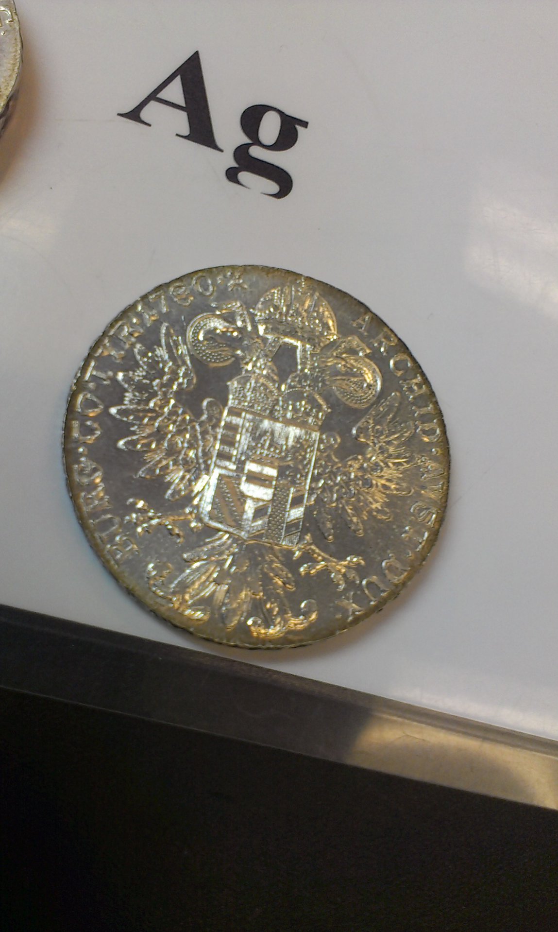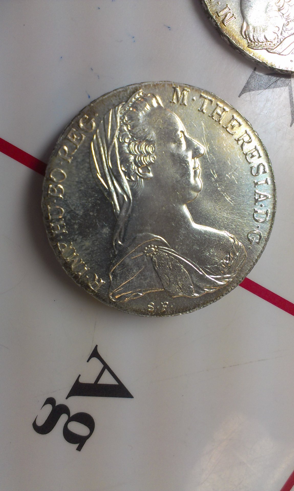 I have several Marie Theresa Thalers and am trying to identify the mints and years of production. These are all dated 1780, but were apparently dated continuously (more than 300,000,000 so far) and can only be dated by minor variations in obverse, reverse, and rim inscriptions. I found a great resource listing the known varieties http://www.theresia.name/cgi-bin/Token.cgi?Shortlist=1&Language=en However, it assumes I know a few things that I don't. For example, many of the varieties are differentiated by the number of beads in the tiara on the obverse (which I think I can ID) & by the number of beads on the crown in the reverse between the big beads (which I have absolutely no idea about - there are 3 different crowns, and I don't know which to count). I picked out one to use as an example - can you help me identify the bead counts on this coin?