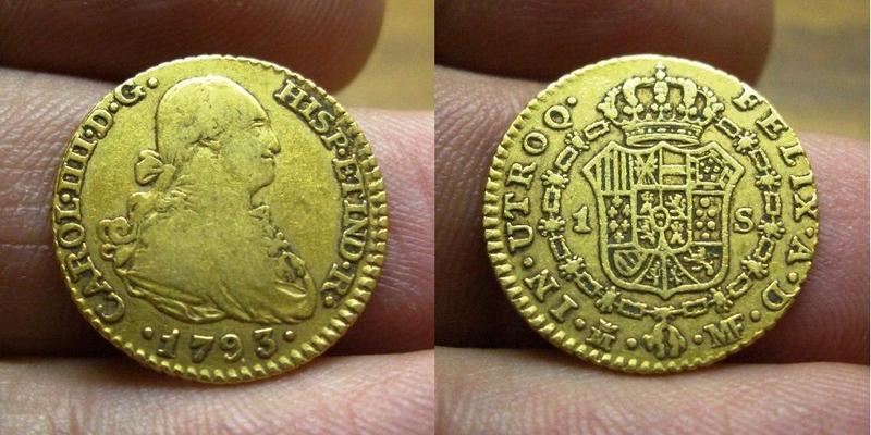 well. now I'm confused even more. if it's 1793 1 escudo, it should be Mint mark with very clear M and crown on top, and on right Mint master initials MF very clear. so I'm not sure ....