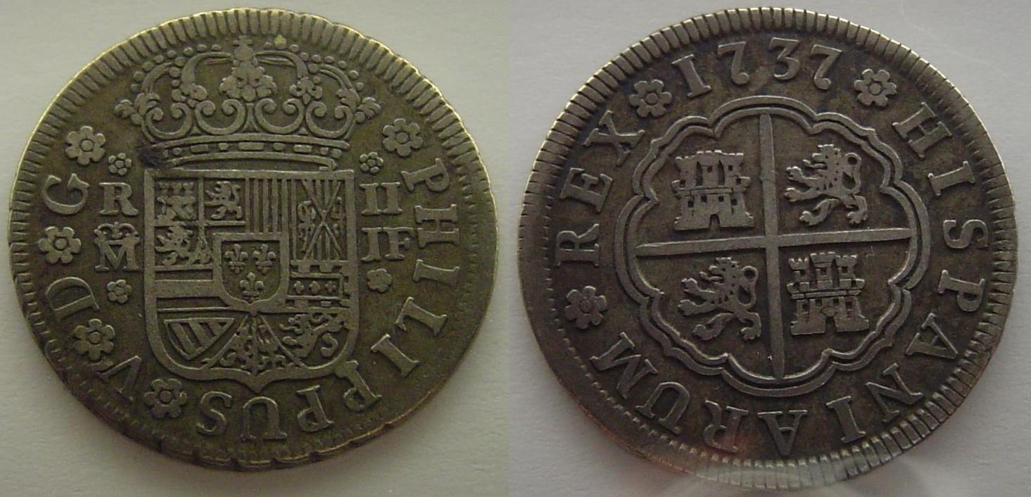 Yep, I agree with Irina, on the OP's coin being a 2 real from Potosi. Ripley's coin does look like it has the ME - LIMAE monogram from Lima. But I also see the M with crown atop to the left of the ME, so the ME might just be moneyers initials and not a mintmark.... I do not know which initials were being used at the time so I cannot say for sure. Also the M E on Ripley's coin looks like there is a little bit of seperation between the two letters, and I have a few from Lima with the LIMAE mintmark monogram, and the M and E are conjoined. Gorgeous coin Ripley, with an absolutely beautiful portrait. The mintmark for Madrid is usually an 'M' with a crown atop it. Such as on this two reales of mine, to the left of the coat of arms, below the letter 'R' .
