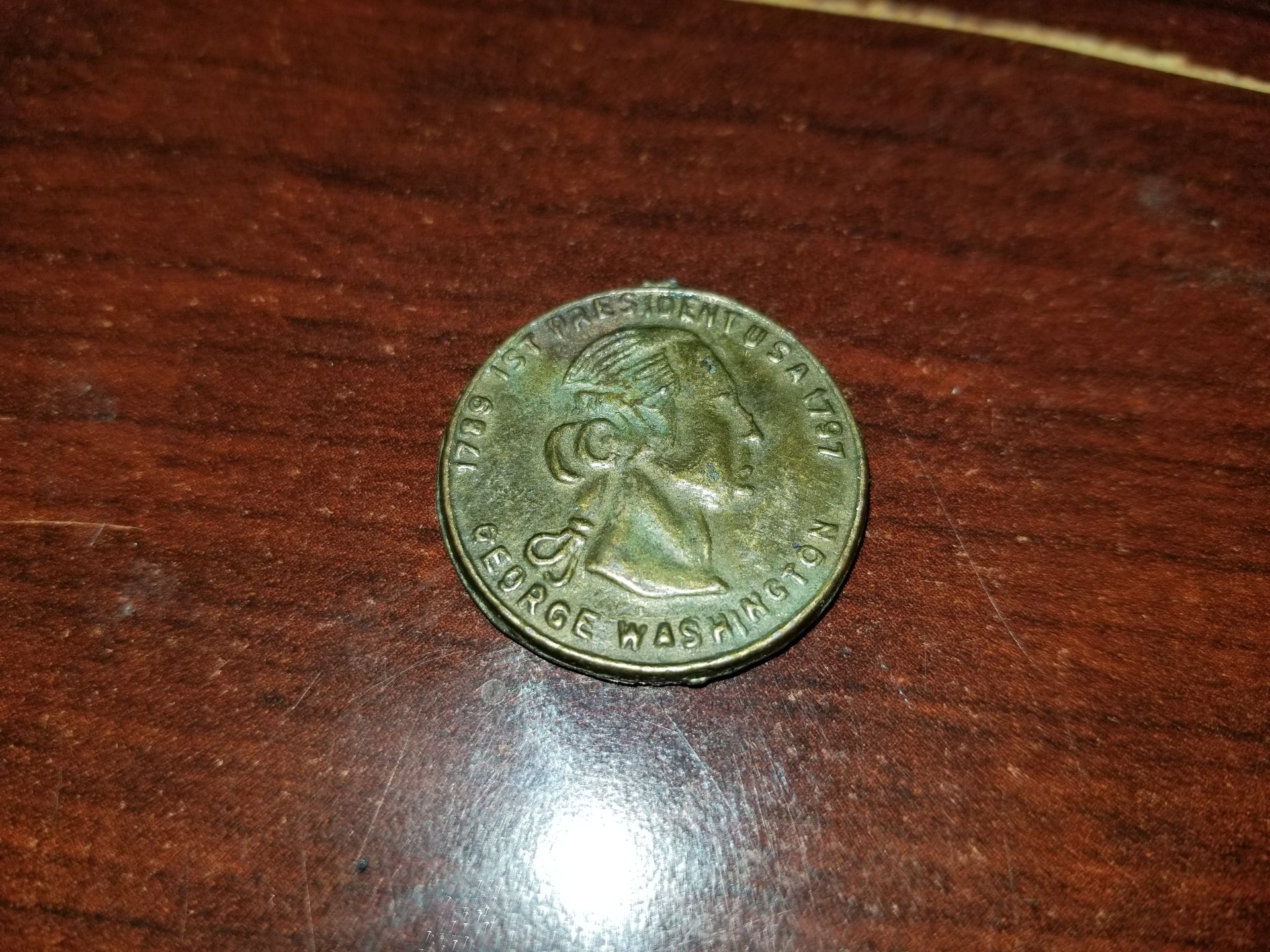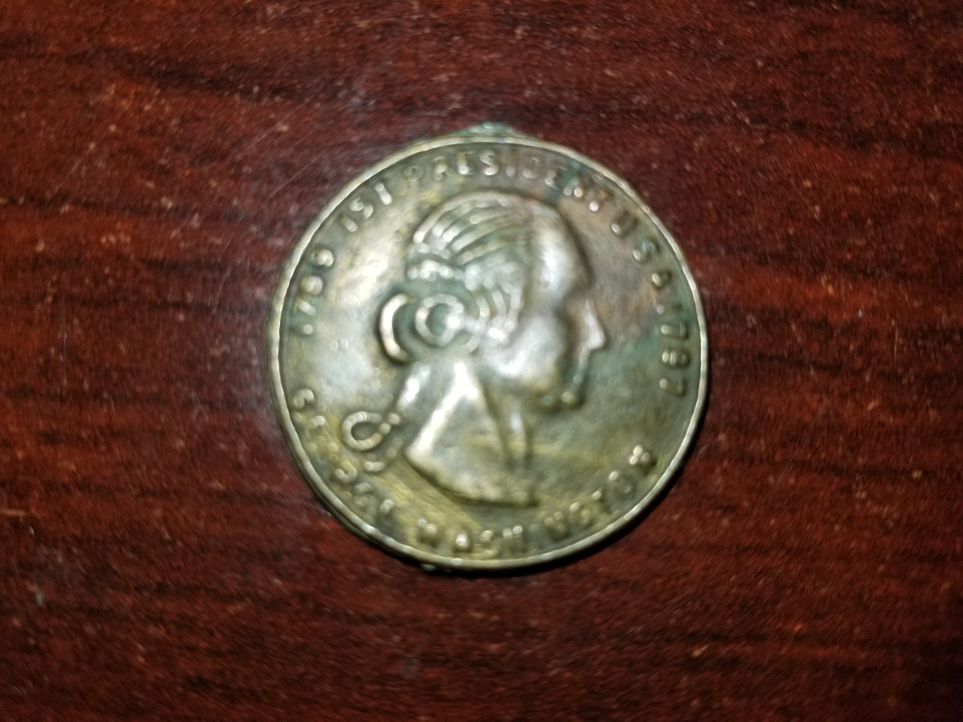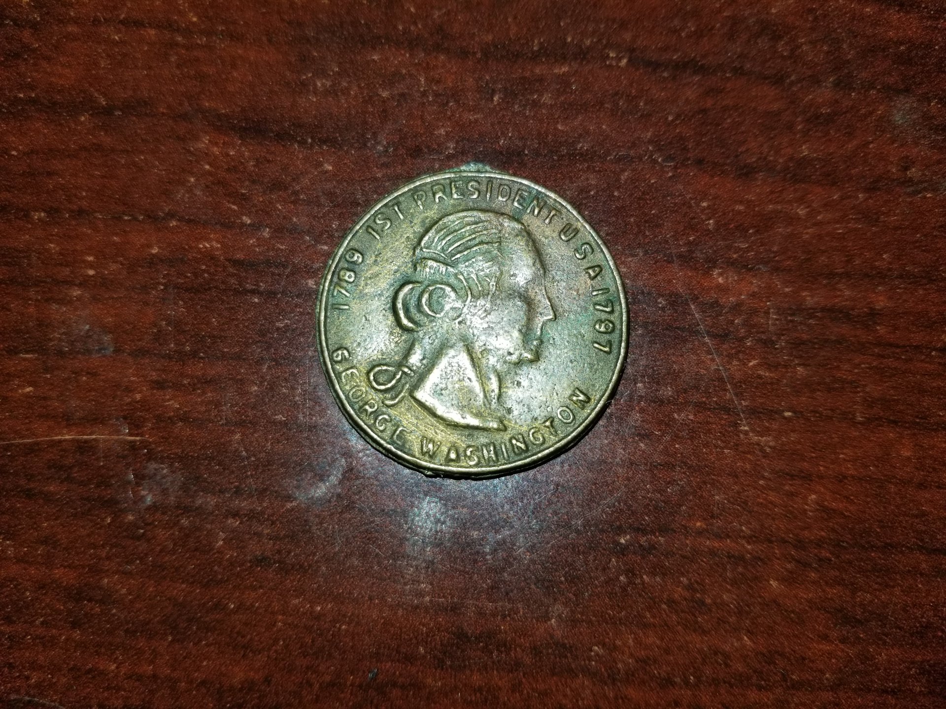 I have the same one its says 1787 1st President U.S.A 1797. Under the face it says George Washington with a hole on top of the head i really believe it worth more the what ebay says ill just get an appraisal