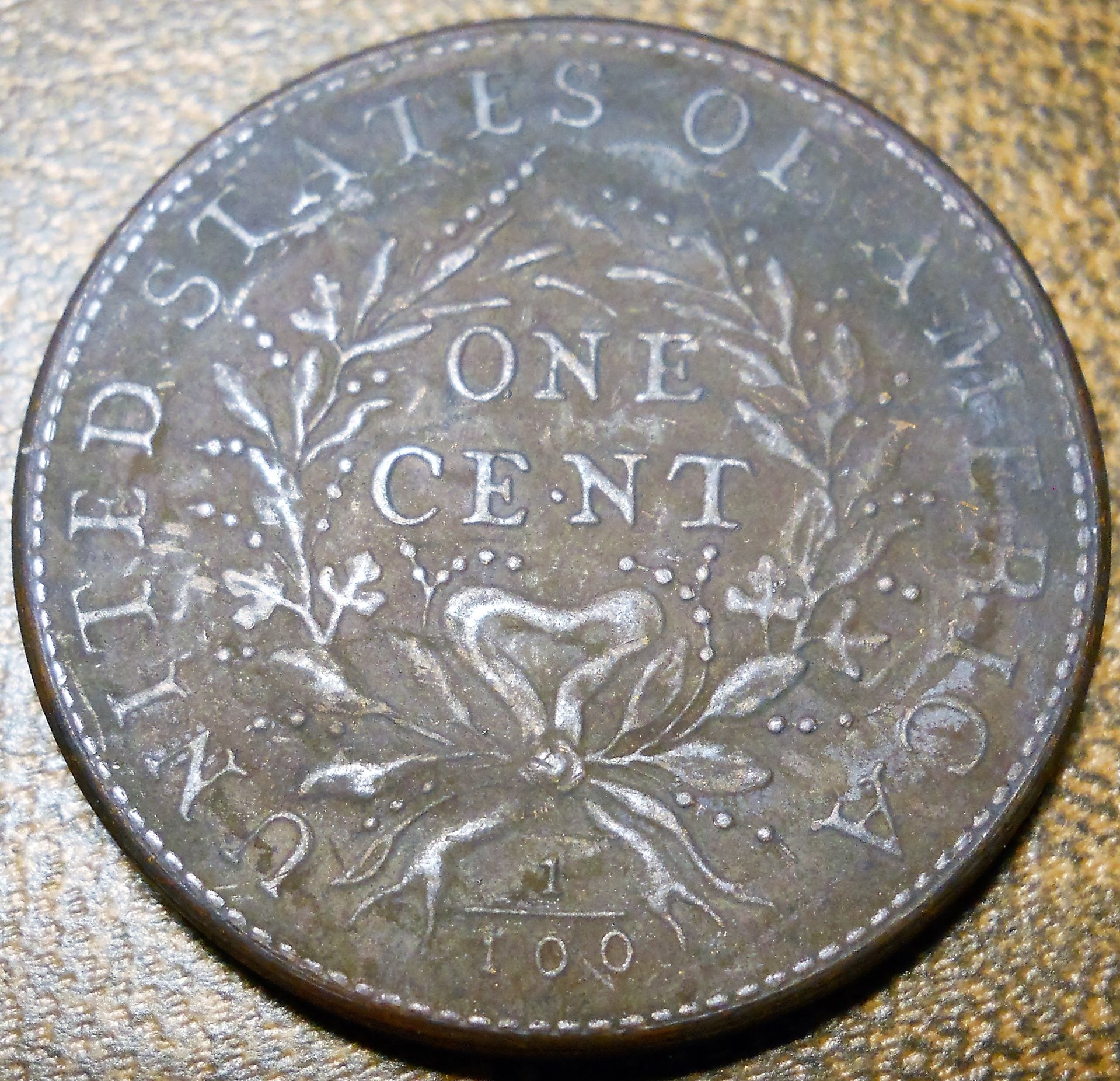 Looks way too clean. Does it have any bars or lettering around the edge?? I cant tell for sure but it looks like some of the leafs in the wreath by the C and T of cent are missing.