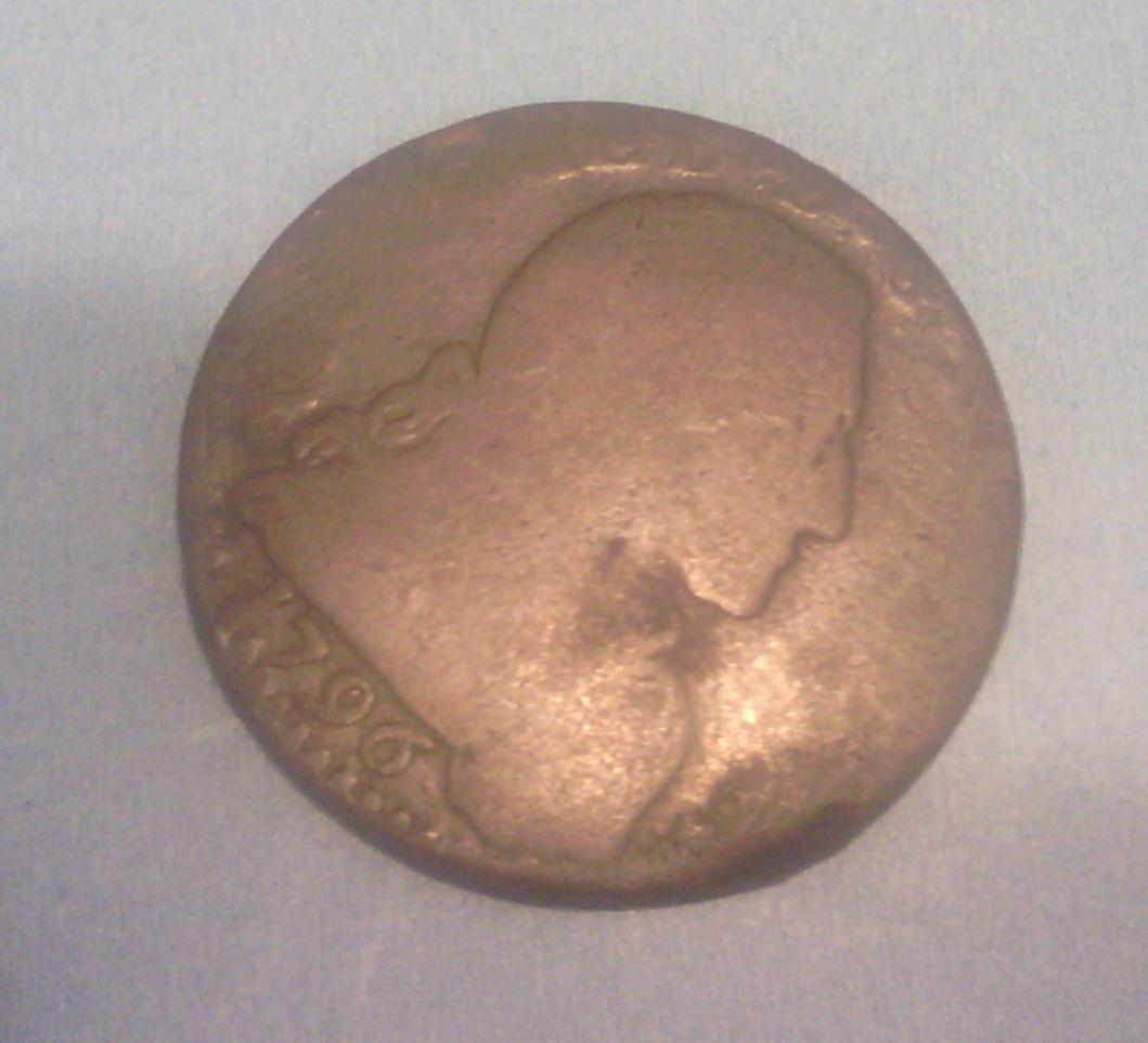 I was wondering if anyone could help me identify this coin. The front states 1796 and their is either a liberty head with a bow or a gentleman in a wig. There is writing on the top but I can't make it out. It doesn't look like liberty but I can't tell. On the back, there is a standing figure holding something (a spear?) to his/her right. I have posted pictures but the picture quality isn't good. I would appreciate any help identifying it. Thank you.