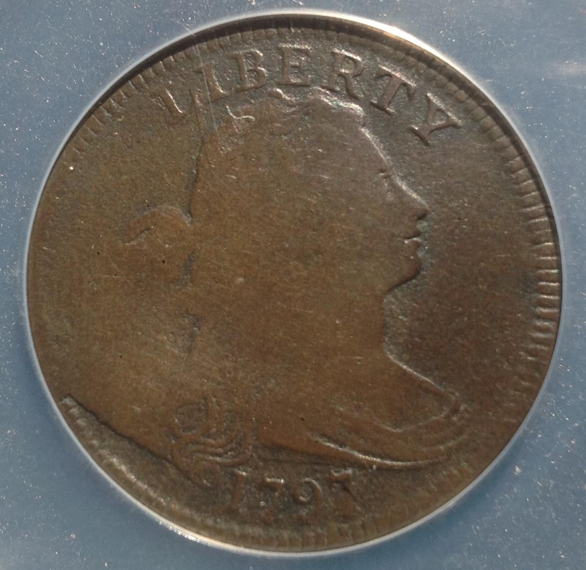 O.K., I am trying my hand at attributing large cents. This is my first time doing this, so I may be off in my analysis. I have a 1797 ANACS large cent that has been graded as VG8 Details. There is no Sheldon attribution on the slab. I don't yet have Penny Whimsy, so I am basing my attribution on the information on Tom Deck's site. Based on the obverse die crack, this seems to be a S-139. Do you think I have the right attribution?
