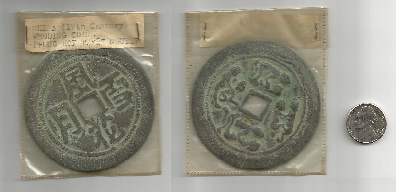 My Grandfather gave me this coin, a (so called) 17th Century Chinese Wedding Coin. On the top the tag reads, "China (17th Century) Wedding Coin PHUNG HOP TUYET NGUYET" The picture is of the front and back of the coin, with the back being next to your average-day nickle. I was wondering if anyone could explain to me what this may be worth and even give me some input on any information on it, if possible.