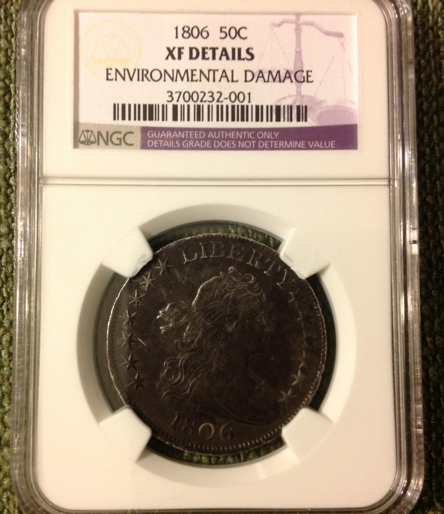 Hi. A few weeks back I posted photos of a 1806 Bust Half that I had in the collection and had considered to be a counterfeit. There was a very good discussion about the coin's authenticity and attribution. I ended up submitting the Bust Half (and four other coins) to NGC. The coins came back today. The verdict on the 1806 Bust Half is ..... Wow - what a surprise. Mark was right on the money (no pun intended) - it came back as "XF details". Well done, sir. Brian - thanks for your excellent information regarding the attribution. In retrospect, I should have chosen the VarietyPlus service as well. I may resubmit it to have that attribution on the slab. One other thing. These were my first TPG submissions -- so this may be nitpicking. The four other coins that I got back (and the other slabbed NGC coins I have seen) have the coins resting between four smooth prongs. The top two prongs on the Bust Half edge-view slab look like they are chipped. A minor point, but it is there nonetheless. Is that a bit of poor QC on the part of NGC? Thanks again to all who offered their thoughts in the original post. I learned a lot. Jonathan