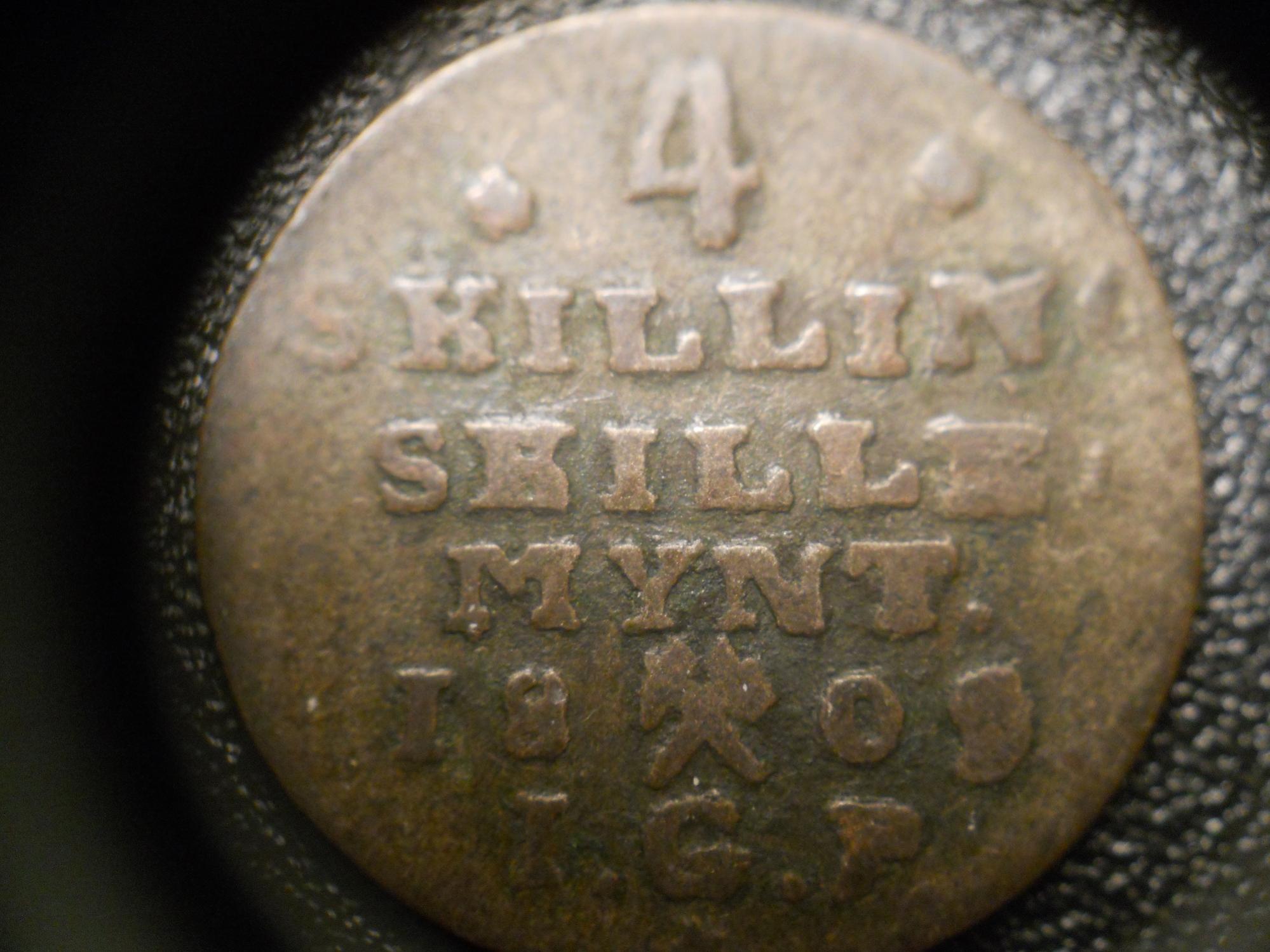 Haven't been able to find out much more than where this is from. Any ideas on approximate value? Going through tons of world coins so I may end up posting here several times the next few days btw. This one says 4 Skilling; Skille mynt; 1809; I.G.P. Thanks in advance! ~lincoln
