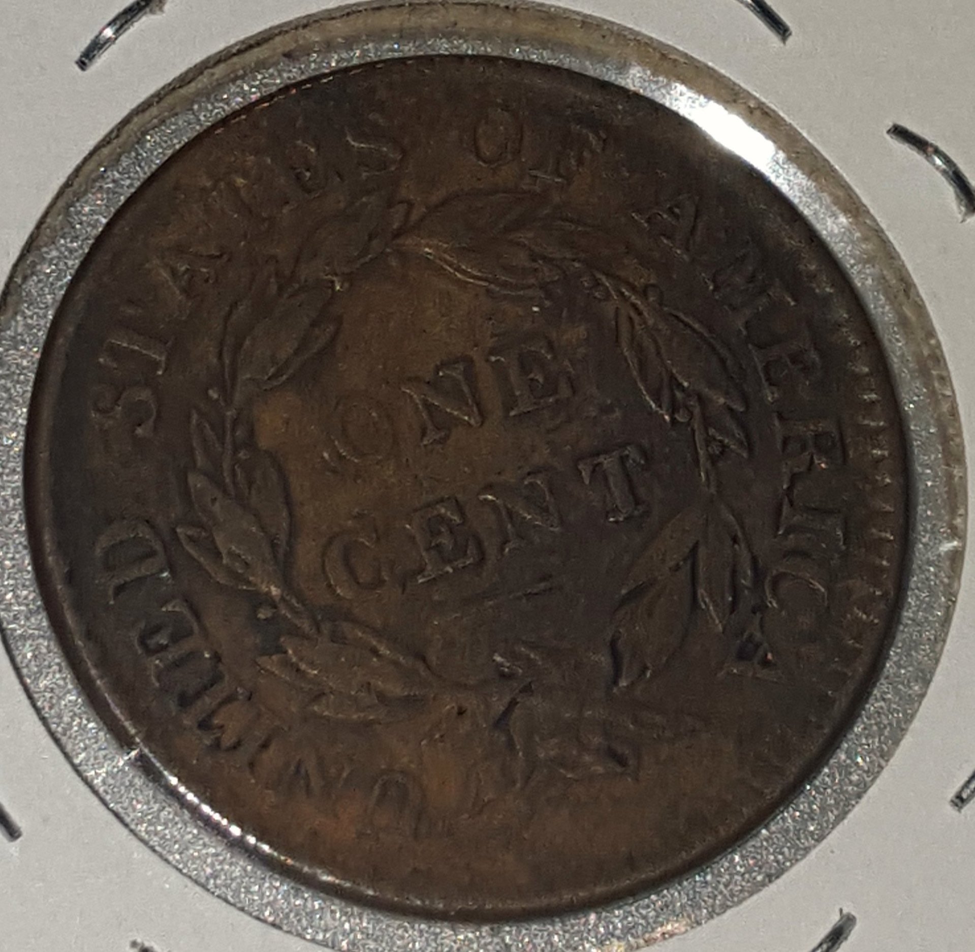 N-6 There are 10 varieties in 1819. one of the first things I look at is the position of the point of leaf below the last S of STATES. On this one it is between the center of the S and the right edge. That is only true of three of the 1819 varieties N-2, N-6 and N-9. On N-2 the point of leaf is left of the center of the upright of the F in OF. that is not true of the OP coin. N-6 N-9 The position of the leaf point is enough to tell it is N-6, but for further confrmation look at the point of leaf below the C in AMERICA. On N-6 it is right of center of the C and on N-9 it is left of center. On N-6 and N-9 the point of leaf below the F is right of the center of the upright of the F.