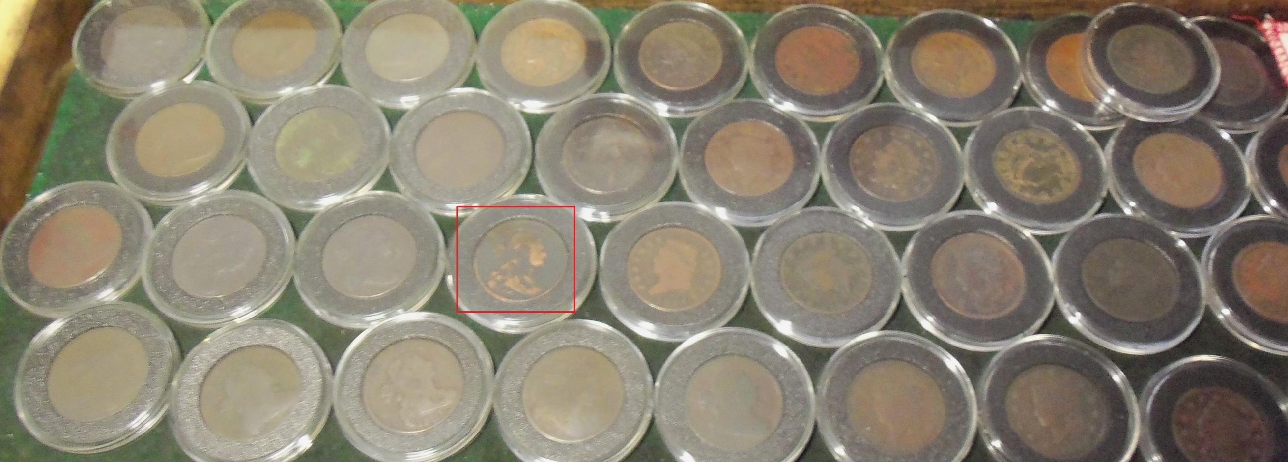 i took the most cleaned large cent i have and stuck it in the middle of my less valueble ones. some of the others have odd coloring because of oxidation or environment but havent been cleaned.