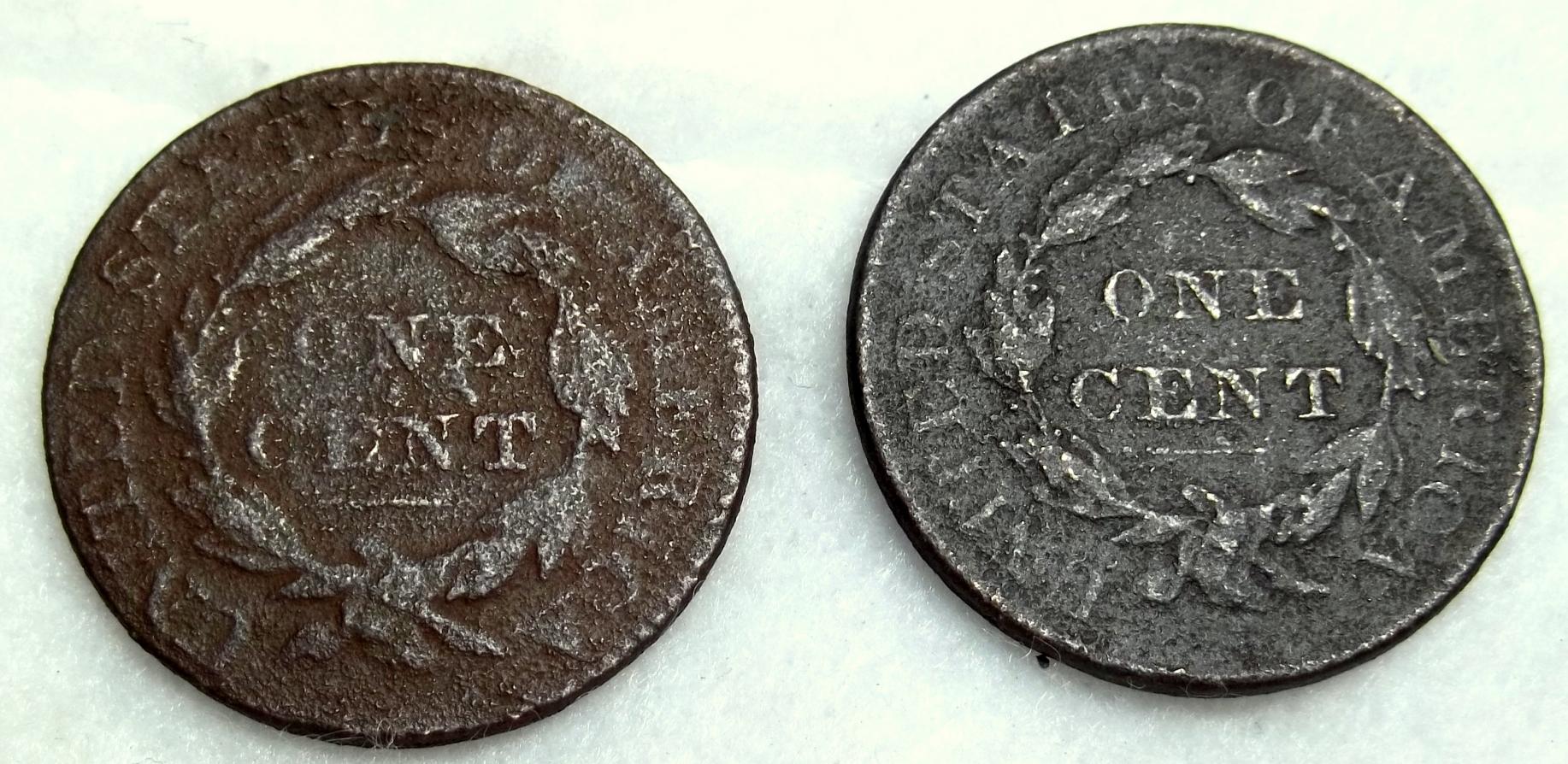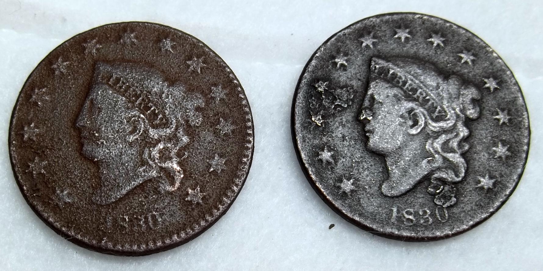 I excavated these 2 1830 large cents from the same site, about 5 feet and 5 minutes apart. The lesser one appears to be an N-9..... Any input sincerely appreciated. Nightowl