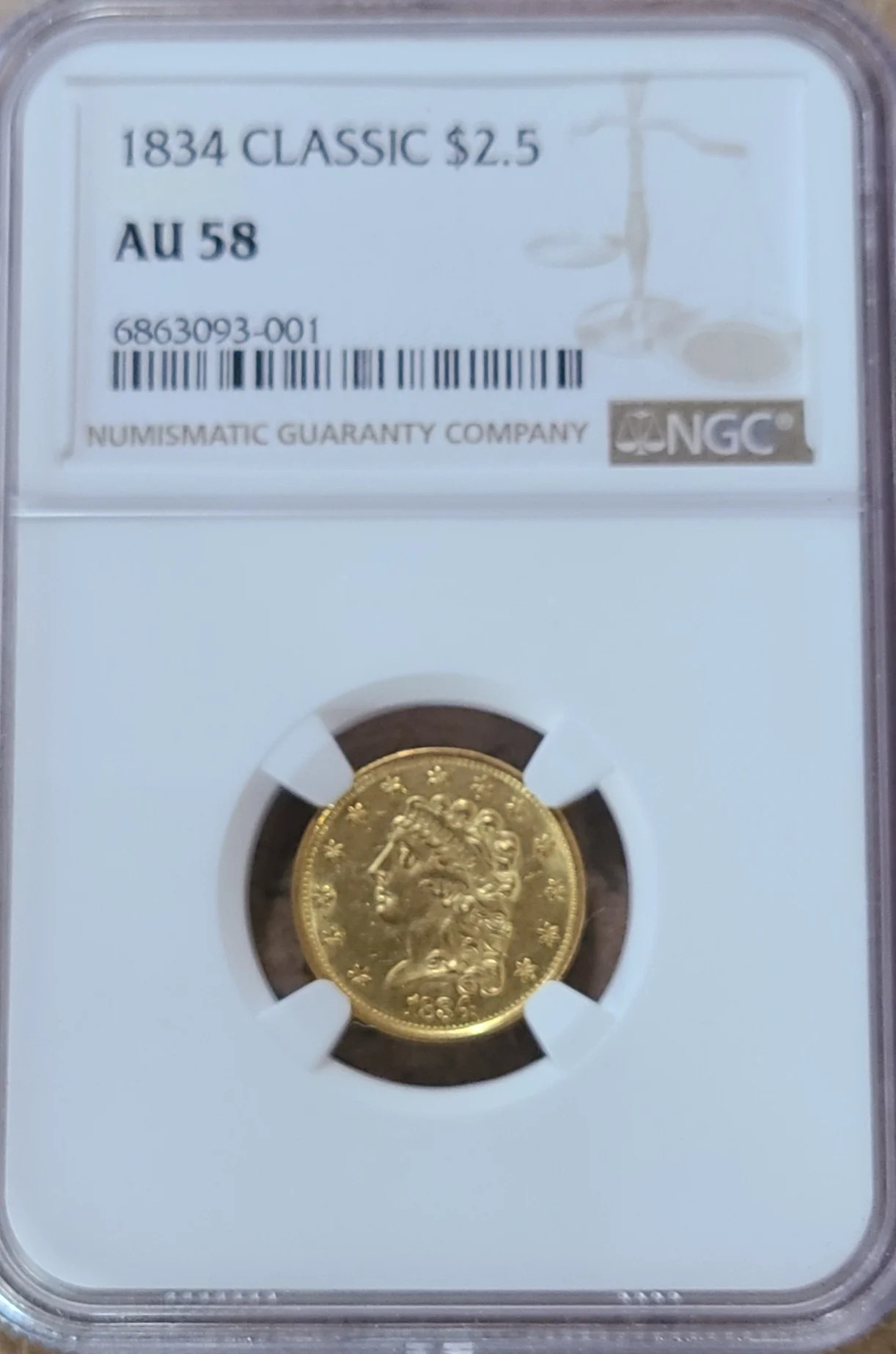 Here's a rarer gold coin of the Classic Head series. Classic Heads were only minted from 1834 thru 1839 and only in quarter eagle ($2.5) and half eagle ($5) denominations. This coin is a series first year minted in 1834. Its graded AU58 by NGC, but looking at it with a loupe I'm surprised it wasn't graded mint state. It has a sharp strike and retains nice luster. There are the typical bag chatter marks in the fields, but no significant marring. Asking $2000, shipped. I'll accept PP or a personal check (held until cleared).