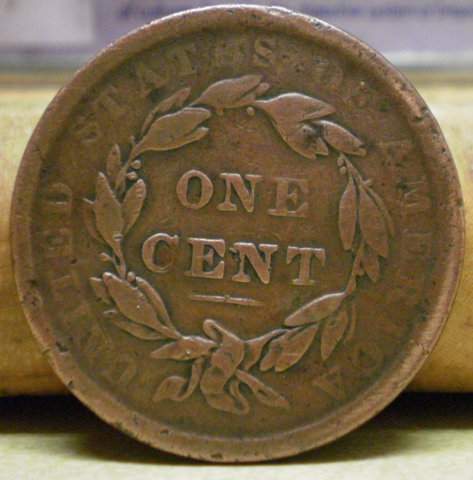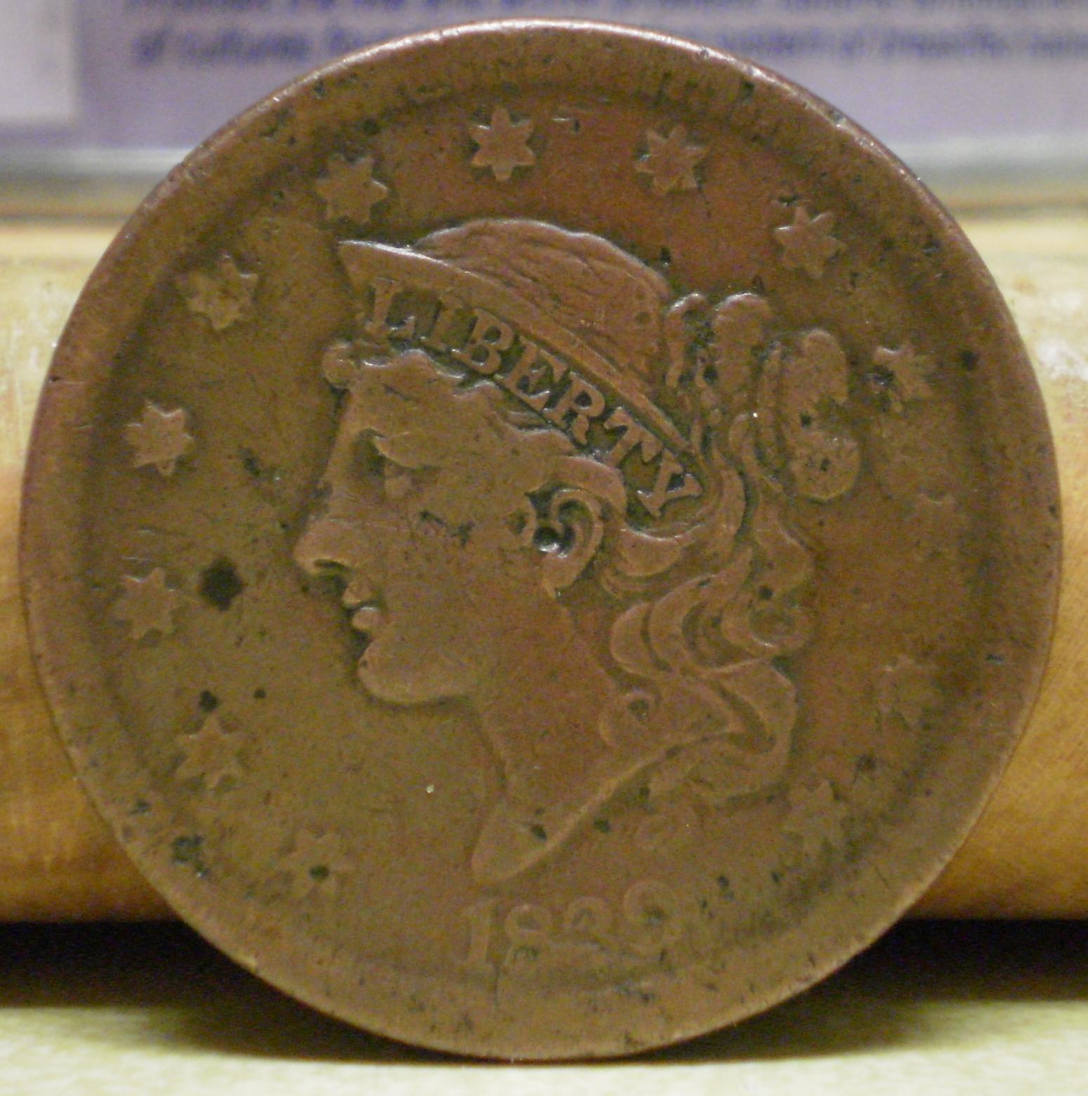 That is an 1839 N9, which is a common variety. I don't see any cuds, but you should keep an eye out as they can be quite valuable. My guess on yours is around a 12 net 7 and worth 10-20 bucks. That is a die crack. That hole in the ear is damage from a punch, someone hit the coin hard with something sharp and it made that depression. The small piece near the N in cent is exactly opposite that punch mark. When they hit the coin the opposite side was pushed out. I don't see it, but I am fairly certain it is not a cud. Probably damage or a lamination. This variety, 39n9, does come with cuds in it's late die state but they are on the rim: http://images.goldbergauctions.com/php/lot_auc.php?site=1&sale=59&lot=553 Most of the cuds on these middle and late date occur on the rim like that. There are some notable, and valuable, exceptions like the 1931 N12 with cuds extending to and eventually over *13: http://images.goldbergauctions.com/php/lot_auc.php?site=1&sale=59&lot=366 Another notable large cud in the middle dates is the 1835 N9, and it's worth keeping an eye out for it as they go for big bucks even in low grade: http://images.goldbergauctions.com/php/lot_auc.php?site=1&sale=59&lot=425 Another one of those 35n9 with both cuds in vg7 sold for around $5,000, but you would have to join EAC to see a picture of that one