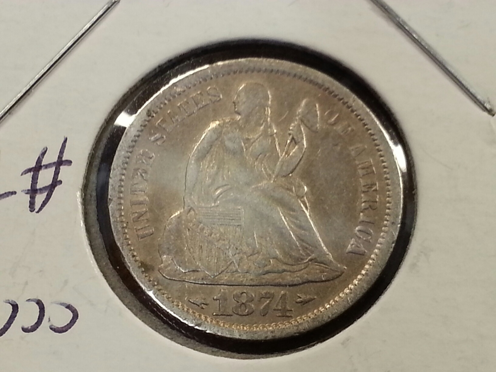 Another round of treasure hunting produces some excellent finds. I'm debating with myself over whether this is an error or just really scratched. If you look at the reverse, particularly the metal around the "I" in Half Dime - you will see what appears to be die break or slag from the original metal around it, and falling down. Then again, it could also just appear to be scratched really badly - and ultimately destroyed. I also came across an 1874-S Seated Liberty Dime in 'at least" VF and I think XF in comparing to some graded XF comparables. Woot! Let me know what y'all think of the reverse on this one.