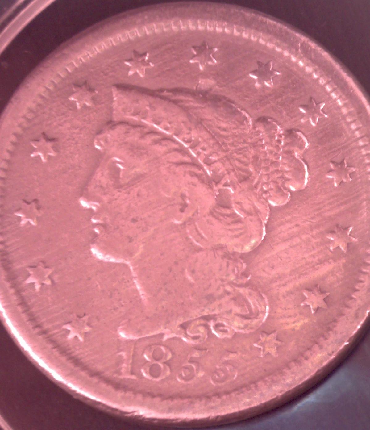 The ironic thing is that I bought an old NES console & some games at a garage sale last week for $20 and then traded that for this large cent, 2 silver proof sets, 2 silver bullion coins, a miniature gold piece (assuming it's fake) AND $60 cash! I haven't decided whether I'm going to keep or sell this one, but I'm pretty excited about the trade. It makes up for all of those bad trades/purchases that I made early on when I was just beginning to collect! Any idea of value? Can it get $50? Also, does anyone else think it could be an error or is it just some type of corrosion?