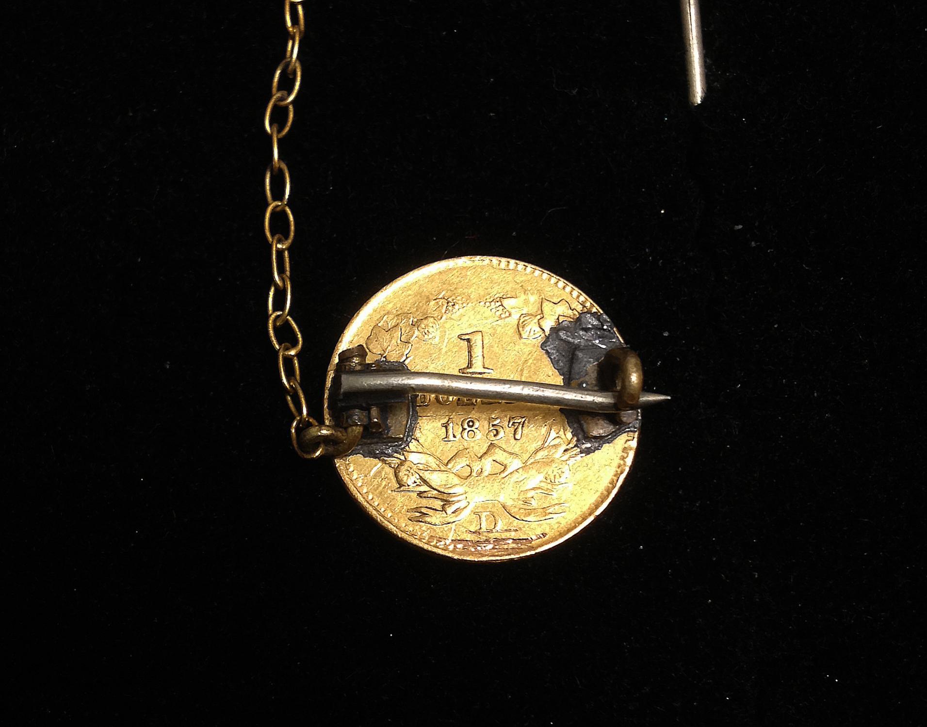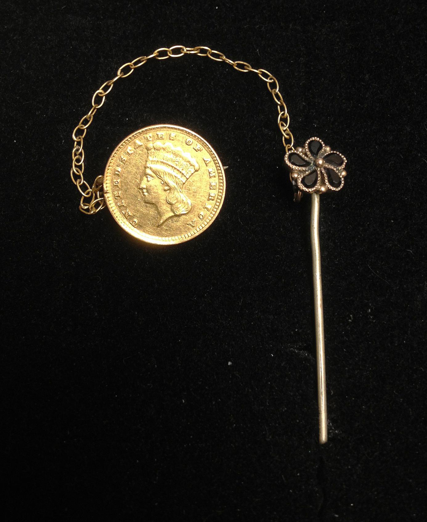 You can be the the bell of the ball at your next social gathering with the 1857 D $1 gold stickpin. Asking $400 delivered inside the US.
