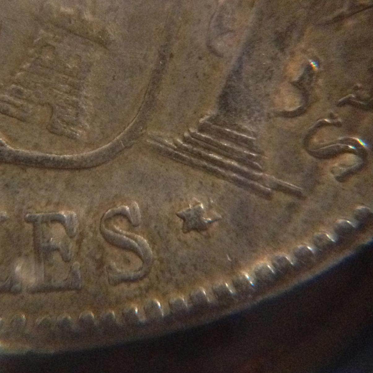 I recently acquired this interesting coin from a souk in Morocco and paid 240 Dirhams (~$28) for it. Upon close examination, I observed several interesting features on the reverse, including what appears to be substantial re-punching (possibly doubling?) and what appears to me to be a four-pointed star mintmark superimposed above a six-pointed star mint mark. Particularly interesting are the 3-legged R in "Reina", as well as the N which appears completely disjointed. There are also some interesting effects in the "20 Reales" and "Las Espanas" including a very pronounced doubled A in "Las." It appears at times that the doubling includes both a thin and fat version of the letter, which makes me suspect repunching (see especialyl the P in "Espanas"). I would be very interested in your thoughts on the coin in general, what is causing these interesting effects on the reverse and if this really could be a coin with both a four-pointed and six-pointed mint mark? It does weigh only 23.77g, which seems to be a bit light although it is a circulated coin. Are there any other potential red flags here?