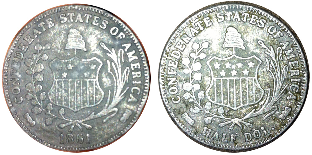 The originals were struck on a planchet using a US obv die and the Confederate reverse die. The Scot restrikes were struck on 1861-O halves with the reverse shaved off using a soft brass plate to cushion the obv and the Confederate reverse die to strike the now blank reverse. You are right though that this is a modern souvenir.