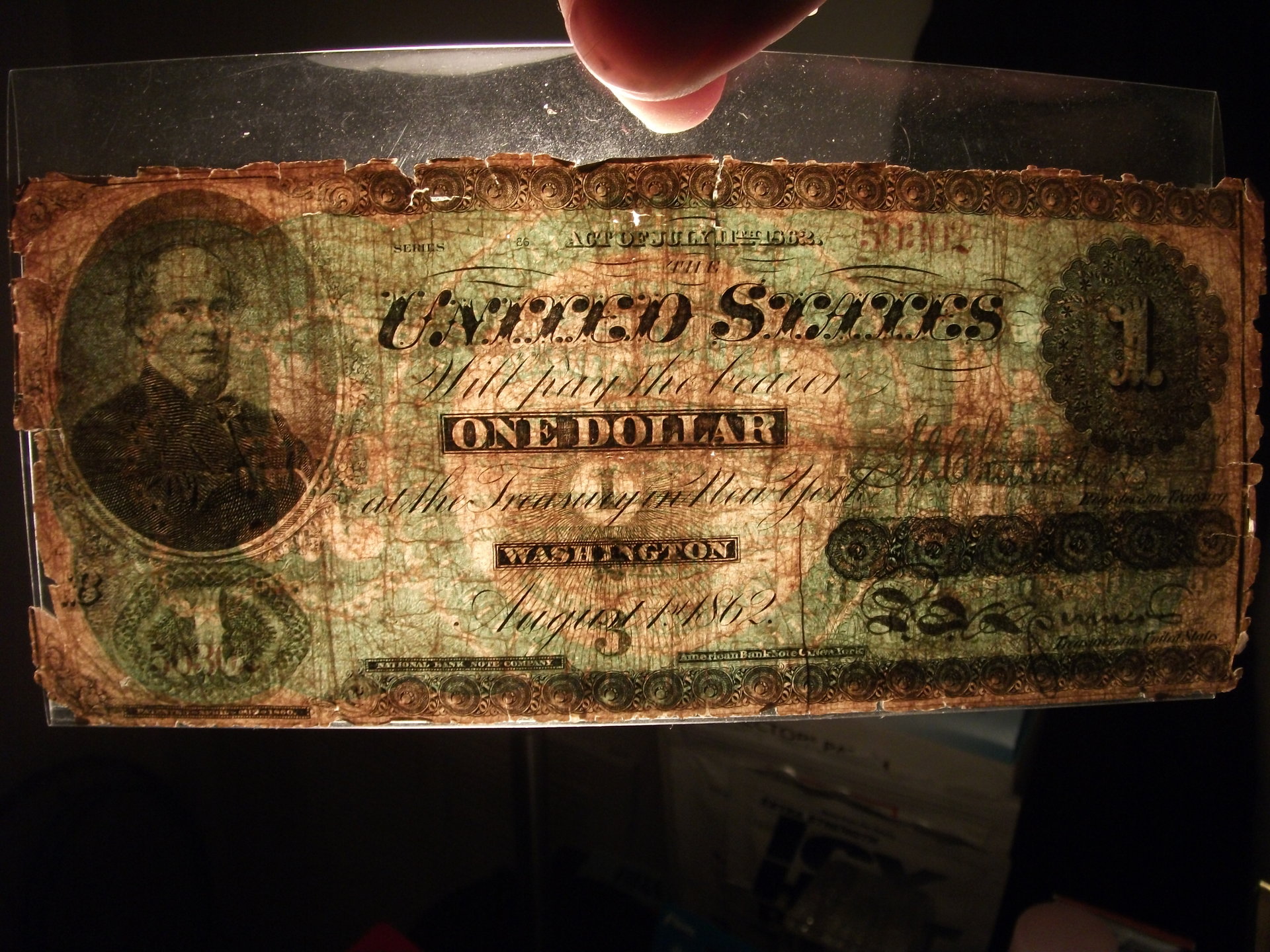 Hello , I have this rare 1862 first U.S Official dollar bill with something that appears a one of a kind error. All 1862 one dollar bills have a red treasury seal( no exception ) , mine has no seal in a way that a white impression of the seal can be seen in the light ( you can almost see the the whole seal in a whitish seal impression ) , but the actual red seal is none existential ... my assumption is it's the obstruction error which prevented the seal color to transfer but left an impression by applying the pressure or maybe a no color ( white )seal !!! , regardless never seen or read anything like this on a 1862 first U.S bill , please let me know what this is and how much the value would be ? Maybe soaring to the skies ?? Your opinions please