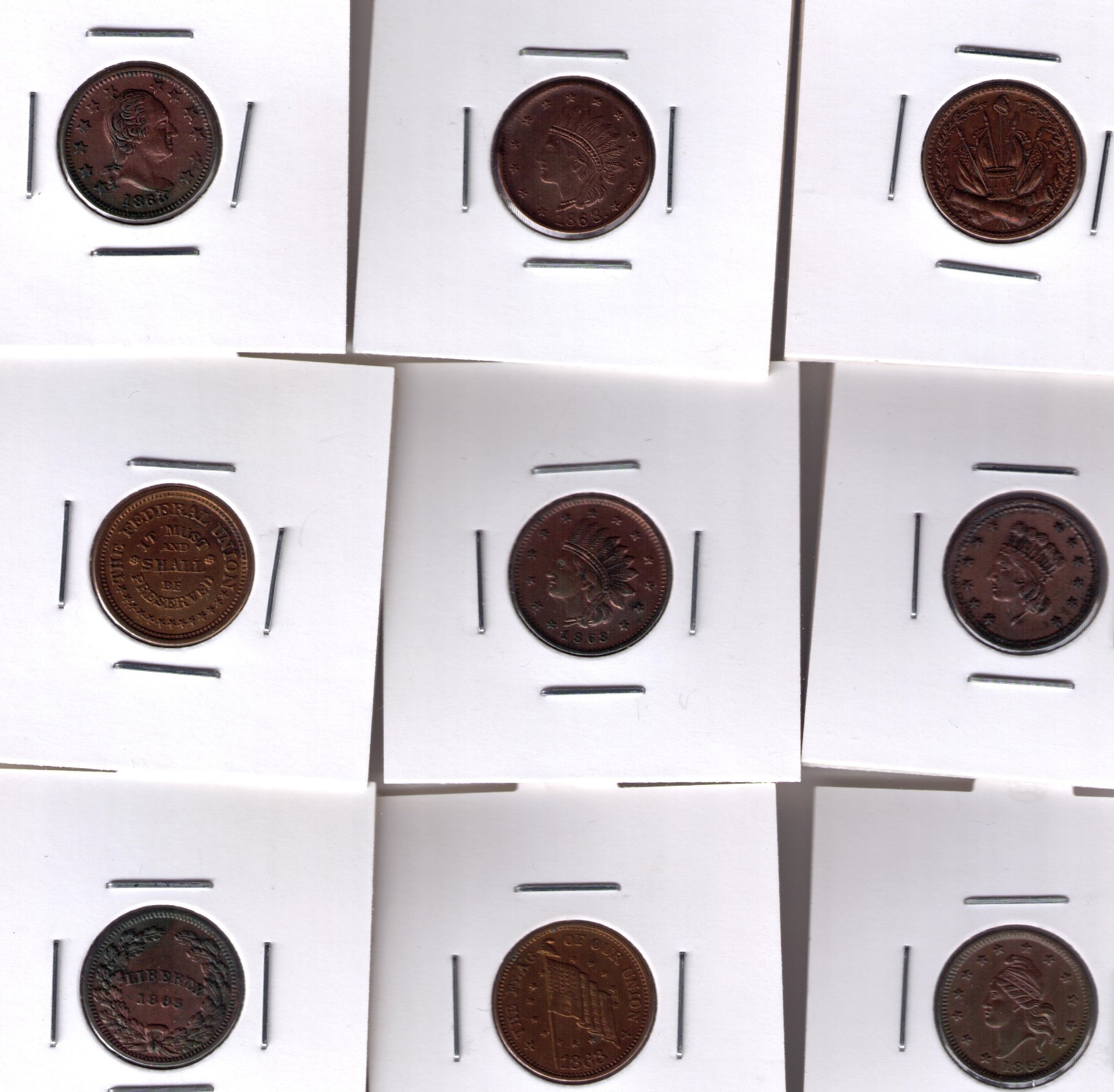 They appear to be nice patriotic tokens which are not rare...appear to be mostly R-1 or R-2. The Washington (obv) is 110/442 R-1 and the 1863 Liberty (obv) is 235/269 R-2. The revised 5th edition Fuld - Patriotic Civil War Tokens is the current best resource book for Patriotic Civil War tokens. Happy researching. Google Civil War Token Society for best group to join and as a source of CWT books. The CWTs, both Patriotic and Store Cards can become an addiction....mine started over 50 years ago.