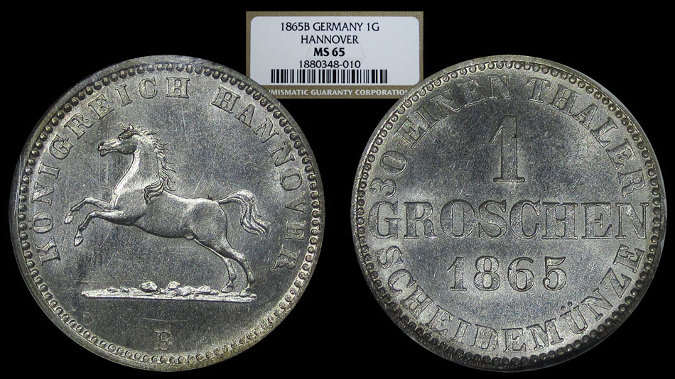 I simply could not pass this one up. This is my newest addition to the growing herd of Kingdom of Hannover coins from 1815-1866 featuring the Saxon Steed. I'm such a fan of this design! There is something quite graceful about this rearing steed, which has been featured on coins at least back to the 1690s from Brunswick-Luneberg and Brunswick-Wolfenbutel. This 1865 issue is one of the last from the "Kingdom of Hannover", as in 1866 Prussia conquered/annexed the Kingdom of Hannover in the Austro-Prussian War, and eventually Germany was unified in 1871. This same rearing horse can still be found today on the flag of the State of Lower Saxony. This coin has a beautiful strong strike and booming luster. I may try to buff up the slab a bit and take another set of pics sometime, but for now here is my new beauty!