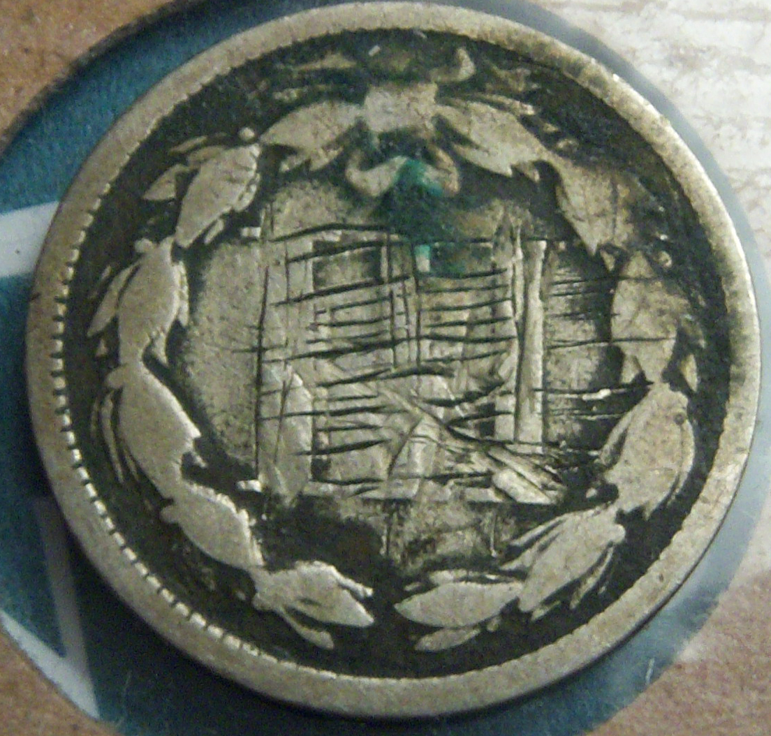 I'm new to this, and am guessing this is coin was maybe run over or someone had fun with their jackknife at some point. The obverse is worn (obviously), but it doesn't show the kind of damage you'd expect from a vice or pliers. Looking closely at the III's it occurred to me that it could be some kind of strange strike through or lamination error?... Again, I'm just trying to learn, so I'd appreciate any input those of you who know about these things might have. Thanks!