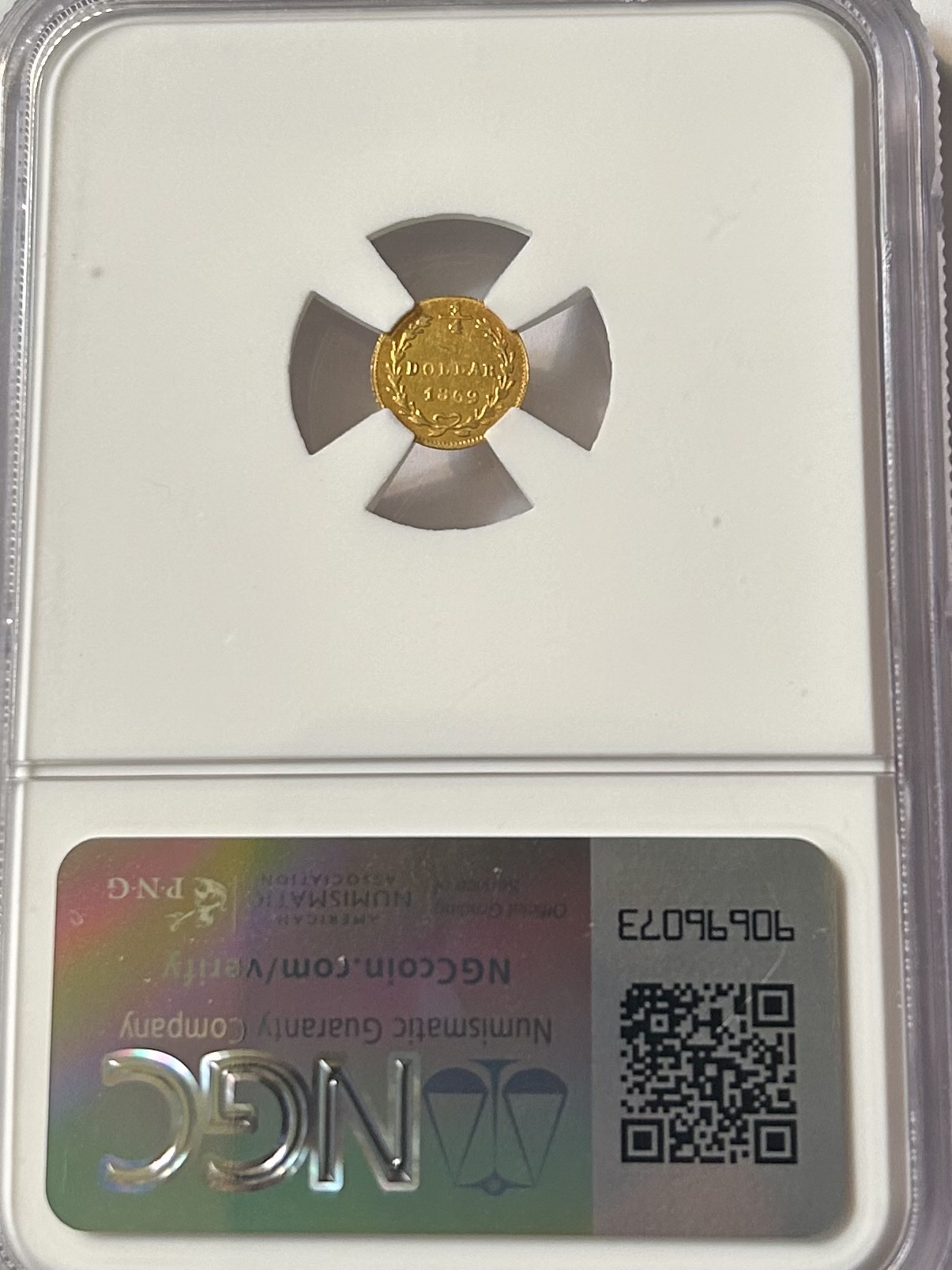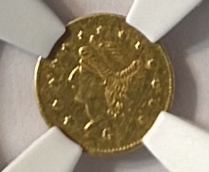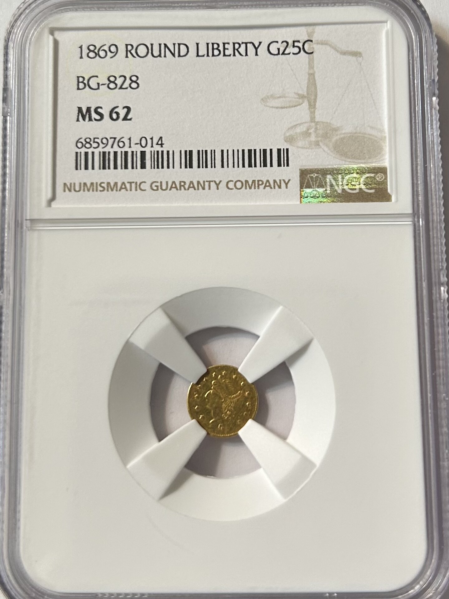 Graded by NGC as a MS-62 so I’m happy with it. An 1869 Round Liberty Quarter struck by a private mint in California. There is a G under Liberty on the obverse and 1/4 at 12 o’clock on the reverse signifying it’s a quarter. The first two photos show the slab and the last two photos show the coin.