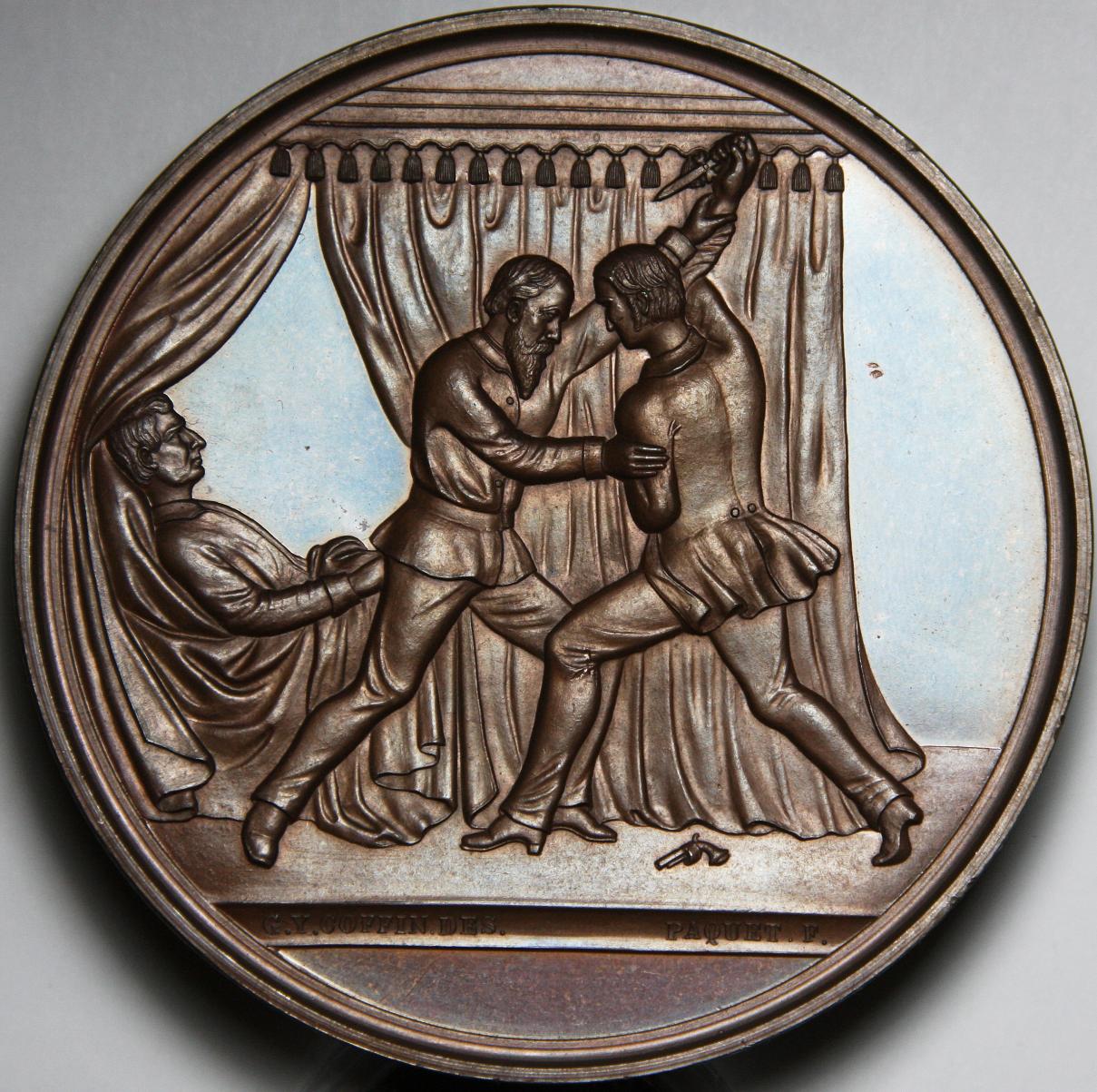 That obverse is almost flawless, it has that one nick. It also seems to have a "sheen" about it in the fields, something short of a patina. Am I seeing this correctly? Either way, I don't normally enjoy medals, but this one looks awesome. Any coin...errr medal... with a knife fight on it is ok with me ... :devil: edit: when I click on the link, they show the coin in the opposite presentation. who is correct on the obverse, reverse question, you or neocollect?