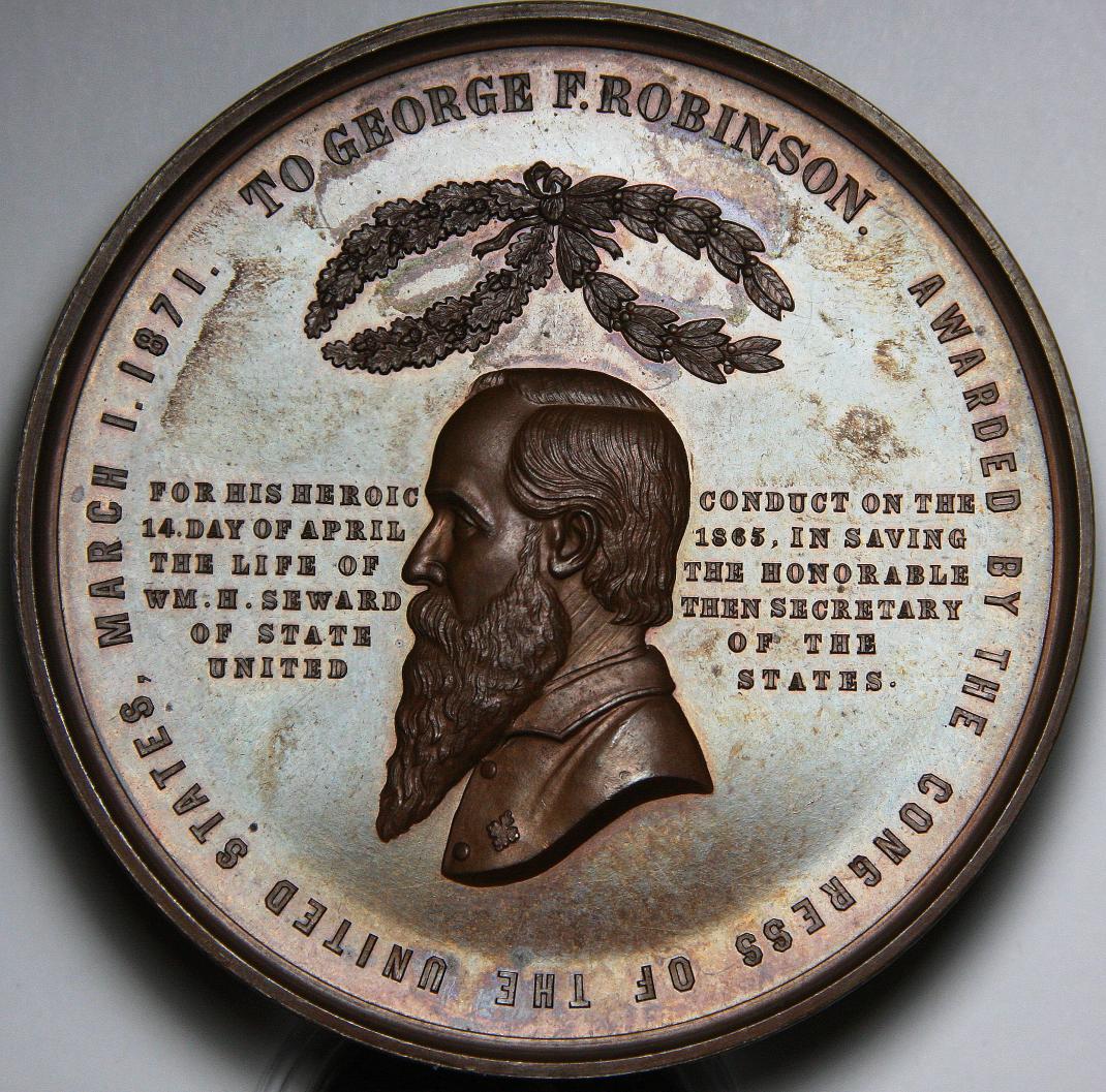 Today I picked up this George F. Robinson medal. Made by the US mint in 1871 to honor George F. Robinson the soldier who foiled the assassination attempt of the secretary of state. Here is info about the medal. http://www.neocollect.com/item/1031/ Here is the piece I picked up. This piece is 78mm.