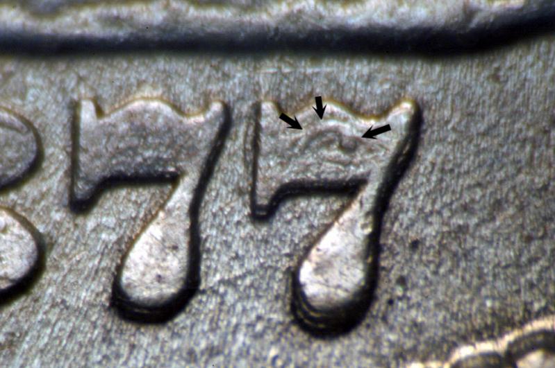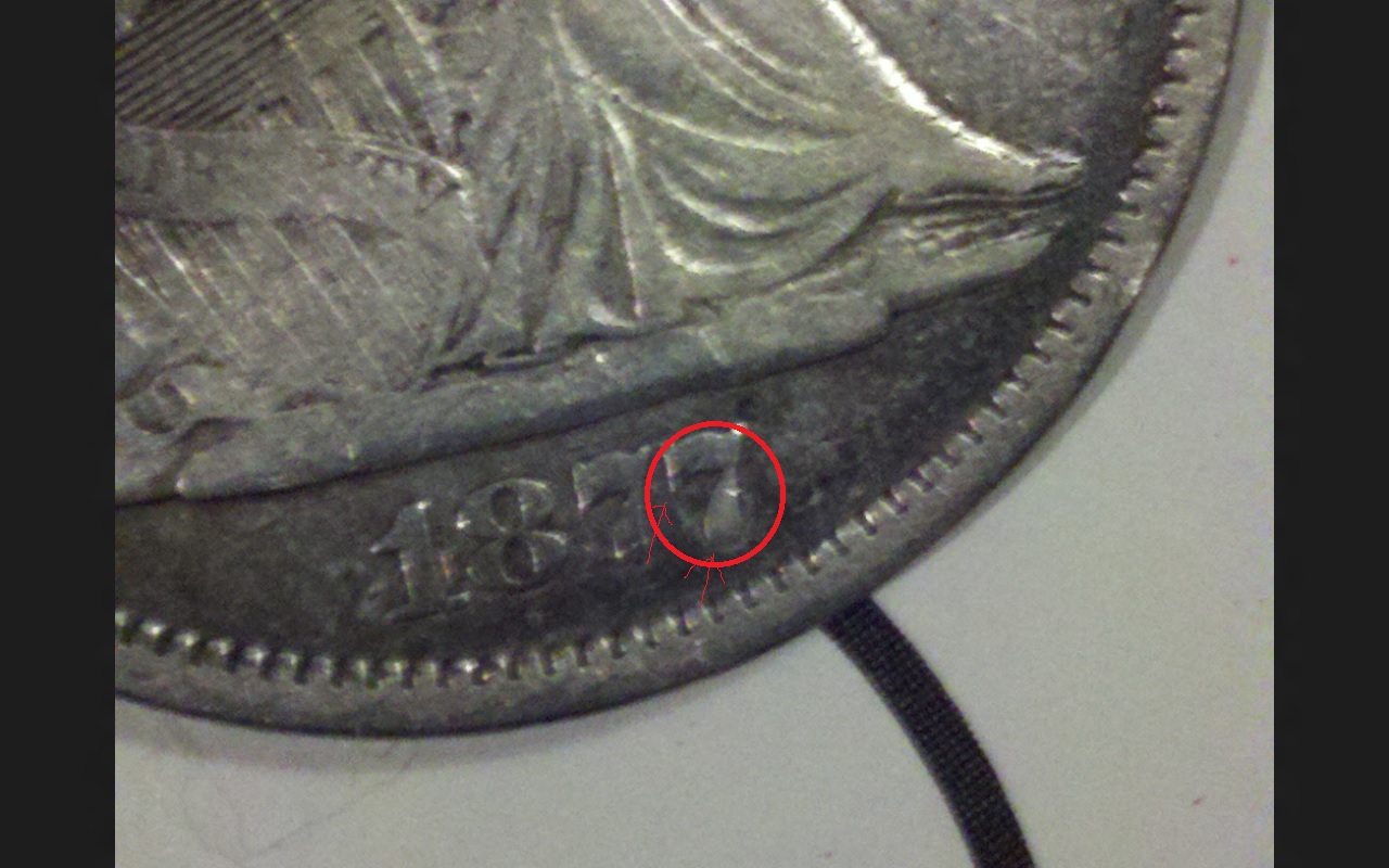 what was said is: "One way to tell if it is an 1877/6 is the bottom of the last 7. See how the bottom is bigger than the bottom of the first 7? The next way to tell...as he had me look through his magnifier...is, see how the mark goes from the inside of the top of the second seven, then sweeps around to the bottom of the seven. that is why the bottom of the second seven is larger than the first seven."